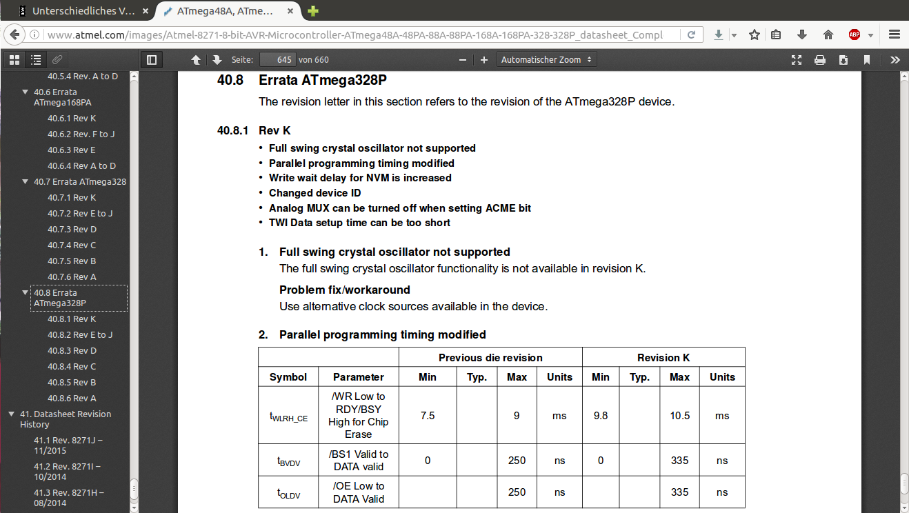 Bernd K. schrieb: > Stefan U. schrieb: >> ATmega328P ist >> nicht gleich ATmega328P > > Jetzt übertreibst Du aber. Keineswegs, selbst wenn es sich um Originalchips aus dem selben Werk handelt. Hast Du schon einmal etwas von Stepping oder Produktrevision etc. gehört? Im Datenblatt von Atmel gibt es ein Kapitel unter dem Namen "Errata"
