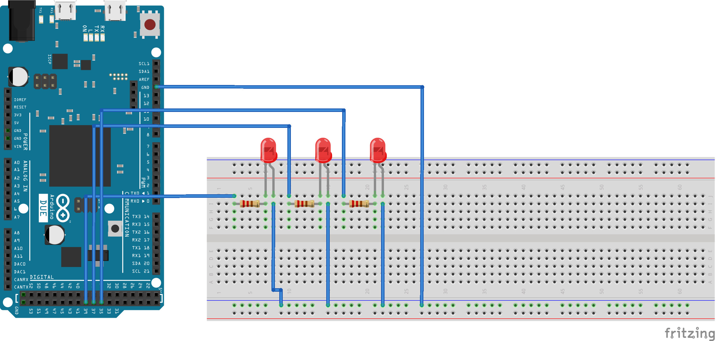 Hallo an alle, vielen Dank für die vielen Rückmeldungen! Ich entschuldige mich für die wenigen Details bezüglich meinem Projekt und die des Boards. Für das chinesische Board habe ich keinen Schaltplan, nehme aber stark an, dass es den gleichen Layout besitzt. Bei der Webseite, in der ich das Board bestellt habe gibt es keine Dokumentation dazu außer dem Vermerk, dass es Revision 3 des Arduino Due Boards ist (wie das originale). Mein Projekt beinhaltet eine Kommunikationsschnittstelle über UART und eine Ansteuerung einer Drehstromsbrücke über die PWM Ausgänge für eine Asynchronmaschine. Die Kommunikationsschnittstelle hat die Aufgabe Befehle entgegen zu nehmen und Messdaten von A/D-Eingängen an eine MATLAB Anwendung zu übertragen. Dazu was nicht funktioniert: Wenn ich einen Befehl zum Starten des Motors versende, blickt kurz die RX LED des Boards auf und es geschieht nichts - ich kann also annehmen, dass der Empfang einer Botschaft nicht ordnungsgemäß verläuft. Die Übertragungsrate ist mit 460800 baud/s angesetzt. Habe allerdings auch 9600 baud/s ausprobiert -- das gleiche traurige Ergebnis. Den Quellcode als Fehlerquelle kann ich wie gesagt ausschließen, weil er auf dem anderen Board anstandslos ausgeführt wird. Den Aufbau meiner Testbench habe ich beigefügt, der Aufbau mit drei LEDs ist trivial. Die LEDs verwende ich nur als visuelles Feedback für die Ansteuerung der Drehstrombrücke. Grüße, Marat