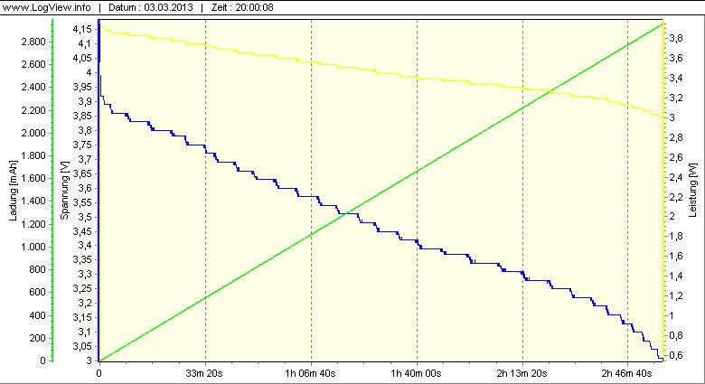 Habe mir eine elektronische Last gebaut, mit der das geht. Nein, erzähle ich jetzt nicht im Detail - dazu gibts hier Milliarden Threads und Anleitungen im Internet. ;) 1h23min, 2870mAh, 3,050V unter 2A Last ...
