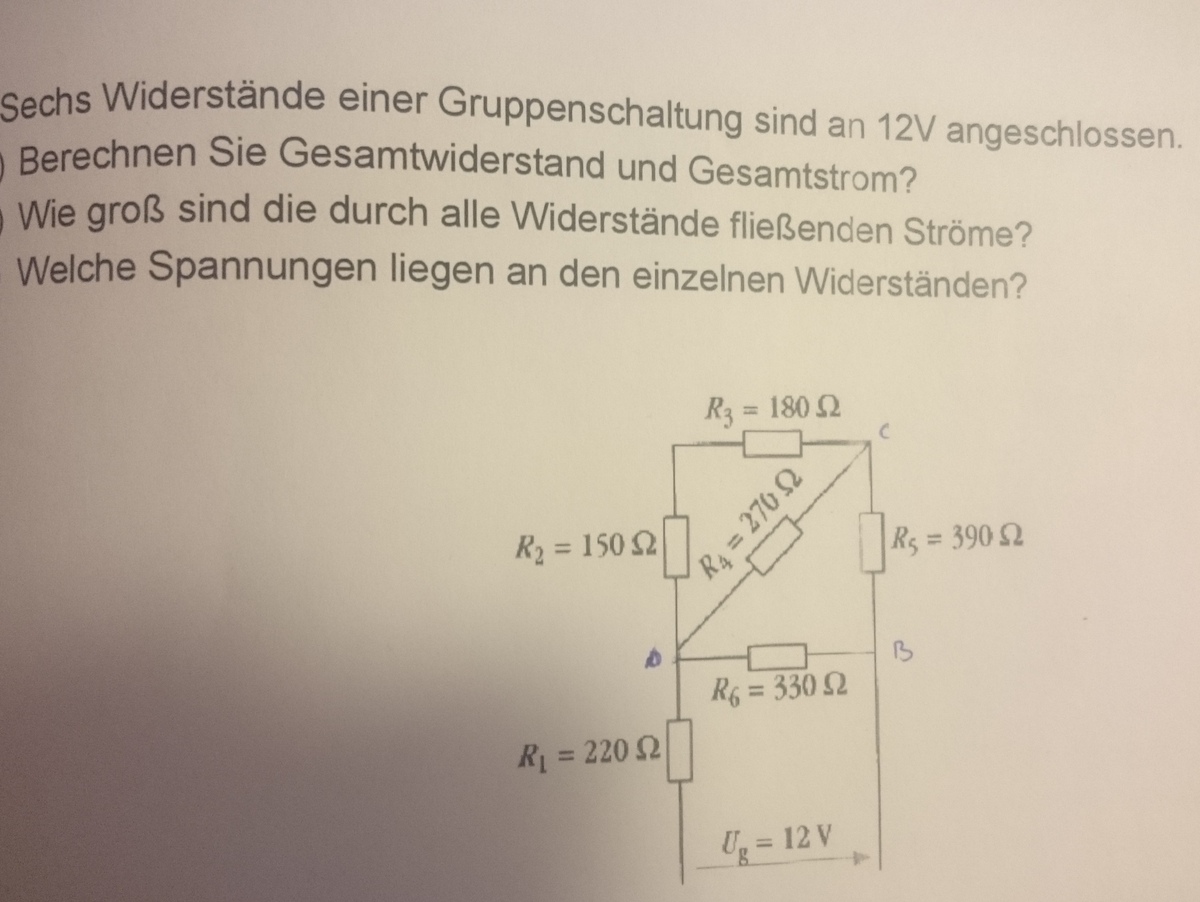wahrscheinlich ist es nur schon zu spät am Abend... Wenn du Rges und Iges schon hast, dann weißt du auch, welche Spannung zwischen a und b abfällt (12V-Iges*R1). Damit weißt du, wie viel Strom über R6 fließt (Uab/R6), der Rest von Iges fließt über die anderen Widerstände ab. Mit I_rest kennst du den Spannungsabfall an R5. Damit weißt du, wie viel Spannung zwischen a und c abfällt, und kannst direkt die noch fehlenden Teilströme berechnen (Uac/R4 bzw. Uac/(R2+R3)).
