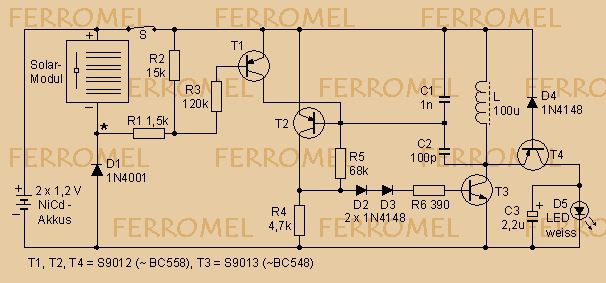 > möchte bestimmen > wann die LEDs angehen sollen anpassen nur wo? Das Verhältnis R1/R2 bestimmt, ab welcher Solar-Modul-Spannung T1 leitet/sperrt und damit den Oszillator T2+T3 stoppt/freigibt.
