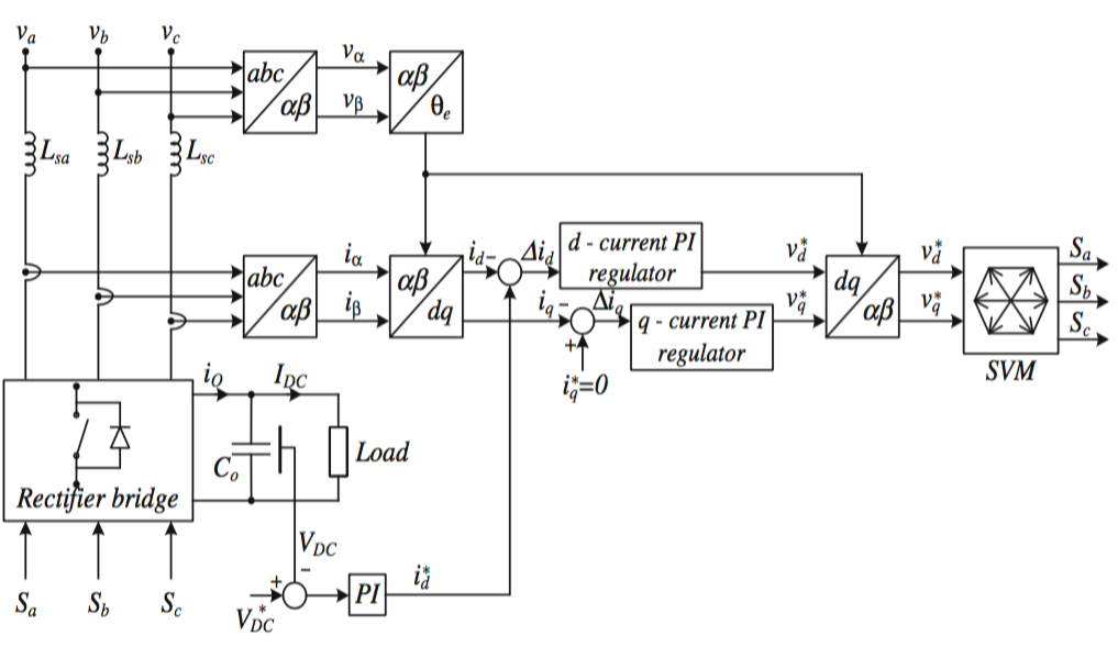 Bei dieser Prinzipschaltung handelt es sich um einen Spannungszwischenkreisumrichter. Du hast schon richtig gesagt, wenn die IGBT des Gleichrichters ausgeschaltet sind handelt es sich um einen passiven Diodengleichrichter. Dieser weist aber eine enorme Netzstromverzerrung auf und produziert Netzblindleistung. Des Weiteren hast du eine vom Netz vorgegebene Ausgangsgleichspannung. Schaltet man nun IGBT oder MOSFET parallel zu den Dioden ist es möglich die Ausgangsgleichspannung zu steuern oder zu regeln. Mit dieser Gleichrichtertopologie kannst du aber die Ausgangsgleichspannung nur hochsetzen. Außerdem ist es möglich mit einer geeigneten Ansteuerung (z.B Spannnungs-Raumzeigermodulation) den Netzstrom mit einem geringen Glättungsaufwand sinusförmig einzuprägen und die Netzblindleistung auf null regeln. Das Blockschaltbild der Regelung befindet sich im Anhang. Um das zu verstehen muss man sich erstmal mit der Raumvektordarstellung des Dreiphasensystems auseinandersetzen. Kennst du dich mit der Park - und Clarke-Transformation aus ? Das war die Kurzfassung was man mit der Schaltung alles so anstellen kann.