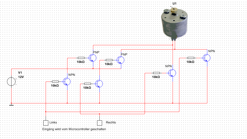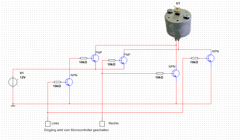 Hallo, ich habe eine Aufgabe bekommen, und zwar bei einem DC-Motor die Stromrichtung zu schalten (Linksrum, Rechtsrum) Ich habe das Plus vom Motor einmal als Plus und einmal als Minus angeschlossen, das Gleiche beim Minus Anschluss. Dann habe ich die PNP mit einem NPN verbunden sodass ich bei Transistoren mit einem +5V Signal schalten kann (Schaltplan liegt als Anhang vor). Meine Frage ist nun wie ich das verbessern kann oder ob das nicht mehr geht. Oder was wäre eure Idee die Stromrichtung zu schalten. Danke im Vorraus