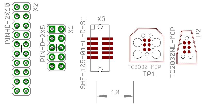 Für verschiedene Jobs gibt es unterschiedliche, passenden Anschlüsse. Außerdem variieren die Geschmäcker. Das Bild im Anhang zeigt Verbinder auf meinen Baugruppen. Mit jedem dieser Verbinder kann man STM32 bespielen. - 2,54mm Standard ARM 2x10 - 2,54mm Compact ARM 2x5 - Samtec SHF 2x5 - TC2030 2x3 mit Rastnasen (TC2050 wäre 2x5) - TC2030NL 2x3 ohne Rastnasen (TC2050NL wäre 2x5) Der TC2030NL wird entweder während der Programmierung von Hand in Position gehalten, oder während der Entwicklung gibt es ein Konterboard, welches von der andere Seite der Platine auf die Führungspins gesteckt wird und damit den NL-Stecker in Position hält.