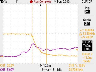 voltwide schrieb: > Die Geheimniskrämerei um ein simplen Sperrwandler finde ich übrigens > ziemlich albern. Sowas ist prior art seit 50 Jahren. Just my 2c Marcus H. schrieb: > Klassisches Problem als Entwickungsdienstleister. Jemand will Dir nur > unter NDA seine neue hyper-duper-Schaltung zeigen. > Und ist dann ganz enttäuscht, wenn der externe Elektronikentwickler das > aus dem Stand analysiert, drei Fehler findet und eine bessere/billigere > Standardschaltung mit Standardbauteilen auf den Tisch legt. Es ist auch albern und wie man sieht auch ziemlich hinderlich manchmal, aber unabhängig davon was es ist, ich darf es schlichtweg nicht. Davon mal abgesehen, unser Flyback ist "hyper-duper". Woher wusstest du dass? ... Ah verstehe, es gibt diese Glaskugel also doch und deine funktioniert auch noch. Respekt man. ;-) Marcus H. schrieb: > Ich habe diesen Frageblock losgeschoben, um rauszubekommen, wo Du > aktuell stehst: Die gesamte Historie dieses Netzteils will ich hier echt nicht ausbreiten. Gut, ihr könnt das ja nicht wissen, aber ich sage nur Redesign, alte Entwicklung externer Dienstleister, damaliger betreuender Entwickler im Ruhestand, usw... Da können manche Fragen nur schwer beantwortet werden. Zurück zu Thema. Die maximale Sperrspannung des Fets wird nicht überschritten. Siehe Bilder. Einen Snubber gibt es auch und dieser wird nicht zu heiß. An dem alten PCB habe ich die Schaltung mit dem PNP mal getestet. Der Effekt war erstaunlich. Der Wirkungsgrad hat sich um mindestens 2.5% verbessert. Natürlich stehen EMV Messungen noch aus. Das ist dann die andere Seite. Marcus H. schrieb: > P_switch kann bei diesem Transistor aber mit anderen Treibern und > optimalem Aufbau ggf. noch auf ca. 0,5W reduziert werden. Wie groß wäre den dann toff? Optimaler Aufbau heißt möglichst kompakt Layoutet, niederinduktiv, ....? Und wie ist dann die EMV in den Griff zu kriegen wenn die Gatekapazität in 2 femto Sekunden leer geräumt wird? Was die Auslegung des PNP angeht habe ich aber das Gefühl, dass das ehr so probiert wird. Jens G. schrieb: > Also mit einem BC327/337 Pärchen im Gegentakt habe ich zwei IRF3205 > parallel mit 20kHz geschaltet, ohne jegliche Vorwiderstände. Also rund > 7nF. Die wurden nur leicht warm, und haben jahrelang gelebt. voltwide schrieb: > Zur gate-Ansteuerung: Ein BC807 zum raschen Abschalten sollte genügen Bestimmt täusche ich mich da. Oder? ;-)