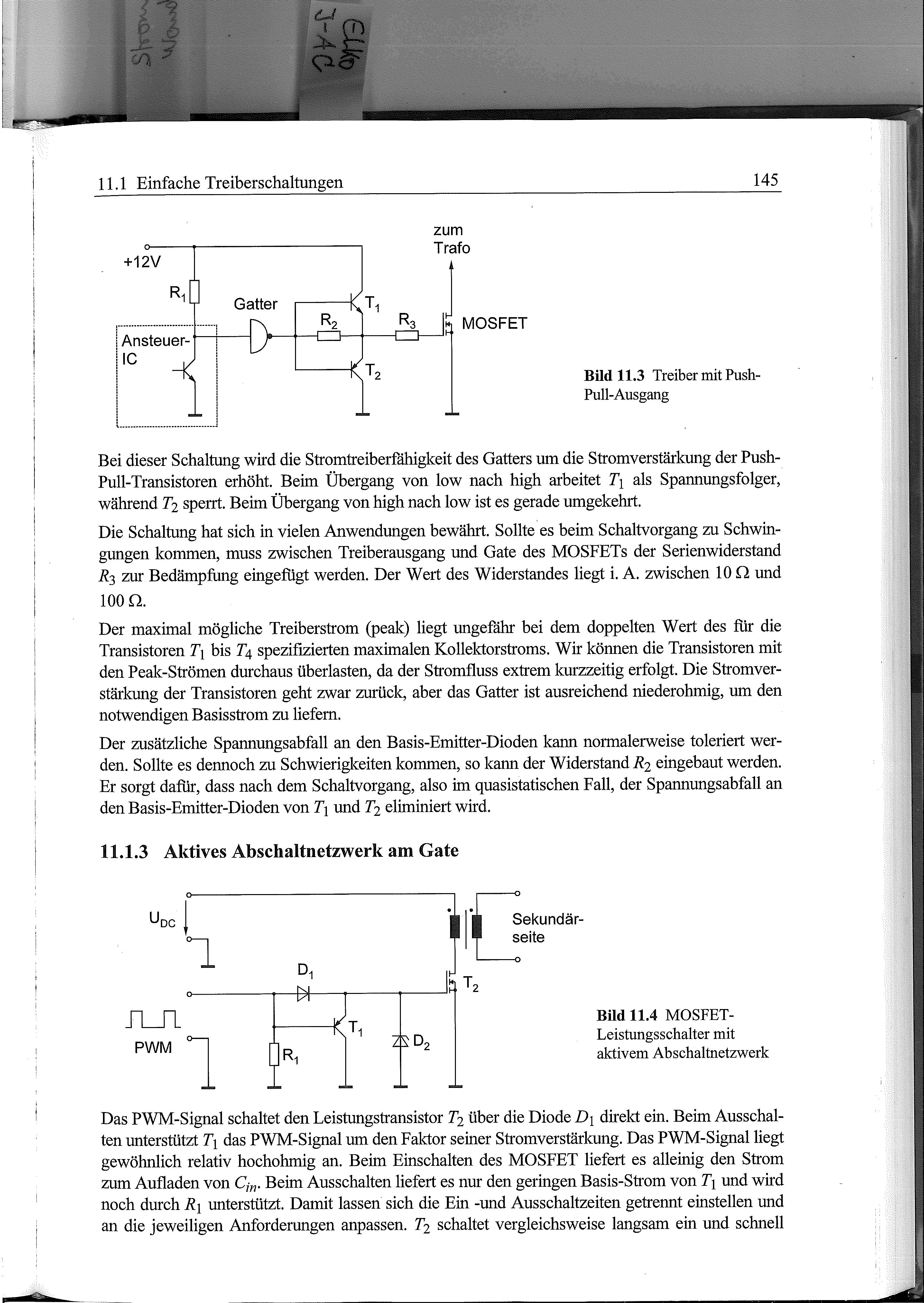 Irgendwie scheine ich mich schwer verständlich auszudrücken. Muss an mir liegen, keine Ahnung. Da ich den Schaltplan nicht posten darf habe ich den Scan erweitert. Fasse nochmal zusammen: Es geht um die Ansteuerung eines Leistungsmosfet in einem Flyback. PWM Regler ist der MIC38HC42 von Micrel. Der Ausgangstreiber kann 1A liefern. Die Versorgungsspannung ist 12V. Der Schaltfet ist der IRFP250PBF von Vishay. Da der Fet zu warm wird, war ich auf der Suche nach einer Schaltung, die ihn schneller abschaltet und bin auf die Möglichkeit mit dem PNP Transistor gekommen. Bei der Auslegung von T1 habe ich mich gefragt, welche Stromspitzen muss der können, da man ja einen aufgeladenen Kondensator gegen Masse zieht und der empfohlene 2N2907 schien mir zu klein. Aber scheinbar habe ich da noch ein Verständnissproblem. Jens G. schrieb: > Also mit einem BC327/337 Pärchen im Gegentakt habe ich zwei IRF3205 > parallel mit 20kHz geschaltet, ohne jegliche Vorwiderstände. Also rund > 7nF. Die wurden nur leicht warm, und haben jahrelang gelebt. Nachdem was Jens G. schreibt, scheint es auch mit kleinen PNP zu funktionieren. Als Auswahl habe ich: BC807-16; BCP53-16 oder BCX42. D1 will ich durch 15R ersetzen, da bei 12V Versorgung dann 0.8A Spitzenstrom ins Gate fliessen. Beim Ausschalten würde das zu lange dauern. Deshalb der PNP. Was sagt Ihr dazu? Marcus H. schrieb: > Es gibt tatsächlich verschiedene Auslegungsziele. > Zunächst möchte man, dass die Schaltung den Einsatz erfolgreich > überlebt. > Danach kommen aber noch so spannende Dinger wie > Verlustleistungsoptimierung, EMV, Kosten, ... Ich bin gerade am 1. Punkt. Die Schaltung soll erstmal überleben.