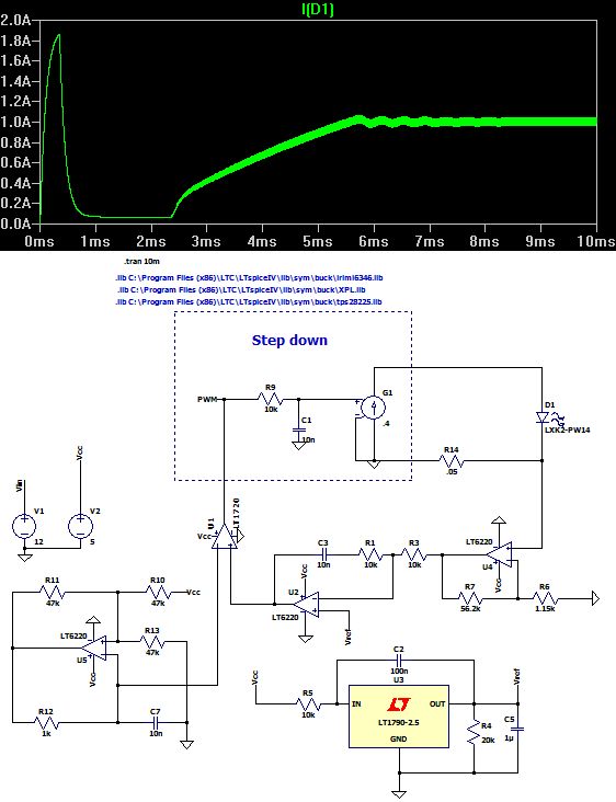 Hallo, für die uni hab ich die Aufagbe einen Abwärtswanlder mit Stromregelung zu simulieren und später auch aufzubauen. Die Eingangsspannung soll 12V DC betragen und die LED hat laut Datenblatt 1050 mA bei 2,95V Flussspannung, für die Simulation benutze ich erstmal einen 3 Ohm Widerstand als Last, das sollte aber erstmal nicht allzuviel an meinem Problem ändern. Beim Aufbau habe ich mich an dem Link orientiert https://home.zhaw.ch/~hrt/EK1/LeistungsFETundIGBT/Spannungsregler.pdf da dort die Spannung gereglet wird habe ich noch einen Shunt hinzugefügt und einen nichtinvertierenden OP der die gemessene Spannung auf 2,5 V bei 1A im Shunt verstärkt, danach sollte die Regelung ja wieder wie in der PDF sein? Simuliert man nun das Ganze kommen kurz mal ein paar pV am Ausgang raus und das war es, aber da das Signal, das an den PWM Eingang des TPS28225 MOSFET Treibers geht nur ca. 2.25mV Beträgt ist das auch nicht so verwunderlich. Nur warum ist die Ausgangsspannung des OPs so gering? Am nichtinvertierenden Eingang liegt ein Dreieckssignal zwischen 1 und 4V an mit einer Frequenz von 330 kHz, am invertierenden Eingang liegt das Reglerausgangssignal an, das zwischen 4.6V und 5V schwankt, müsste der OP (U1 in der Schaltung) nicht komplett "aufmachen" wenn eine Differenz zwischen den Eingängen herrscht und dann so ein Rechtecksignal erzeugen? Weiß jemand wo das proglem liegt, dass kein Rechtecksignal am Ausgang von U1 entsteht? Un das zweite Problem liegt beim Erzeugen des Dreiecksignals, unten links mit dem OP. Am Punkt "Vdreieck" liegt zwar mein gewünschtes Signal an, sobald man es aber mit dem nichtinvertierenden Eingang von U1 verbindet sieht man nurnoch eine konstante Spannung von ca. 1,7V, woher kommt das?? Zeitlich wird es langsam etwas knapp, deswgen hoffe ich, dass mir jemand dabei helfen kann, vielen Dank schonmal und schöne Grüße.