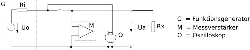 Hallo Clemens > Problem ist hier, dass > ich nicht die Ampere einstellen kann, sondern nur die Volt und dann mit > dem Widerstand (den ich schlecht messen und berechnen kann) die > Stromstärke ausrechne. Also muss ich eine Lösung finden: Es wird nicht > möglich sein alles berücksichtigen zu können, aber je genauer desto > besser. Hier hilft der bekannte Innenwiderstand des Funktionsgenerators. Einmal mit Last und einmal im Leerlauf messen. Siehe Anhang. Falls Rx nicht klein genug noch einen zusätzlichen Widerstand in Serie schalten. Mit der kleinsten Spannung beginnend herantasten. (Vorgängig den Eingangsspanngsbereich des Messsverstärkers prüfen. Empfindlichkeit und Spannungsfestigkeit) > Mein größtes Problem zur Zeit ist aber, wie ich diese Geräte > (Oszilloskop, Messverstärker, Funktionsgenerator, Elektroden und evtl > noch Multimeter) verbinde und bediene. Dem Rat von Wolfgang A. schliess ich mich an. "Ruhig die Bedienung der Geräte zeigen zu lassen." Gruss Richard