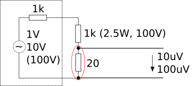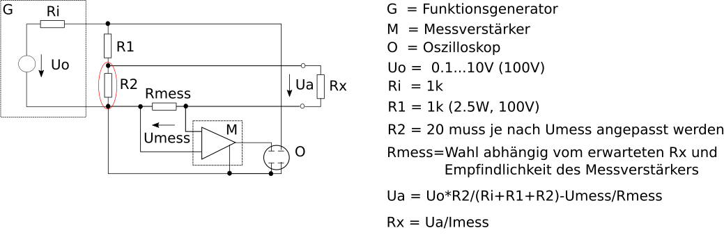 Hallo Clemens Wie lauten die Typenbezeichnungen des Messverstärkers und des Oszilloskopes? Im angehängten Schema ist der Geräte-Innenwiderstand Bestandteil des Spannungsteilers. Wichtig! Der mit rotem Kreis bezeichnete Bereich muss unterbrechungssicher sein (Mechanisch geschützt und elektrisch richtig dimensioniert). Andernfalls liegt die volle Leerlaufsspannung des Generators an den Elektroden. Aus dem selben Grund nicht auf 100V schalten (Lebensgefahr bei Unterbrechung innerhalb des roten Kreises). Ist die Anordnung der Elektroden vorgegeben? Durch eine Norm? Ist ein homogones Feld gewünscht? Gruss Richard