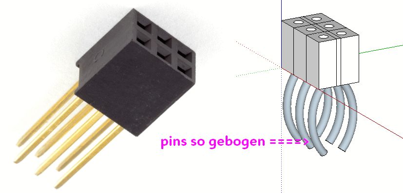 So ungefähr. Die Platine wird für den besten Kontakt idealerweise nur soweit auf die Pins geschoben, bis wo die maximale Auslenkung ist. Ich war gedanklich eher von einer einreihigen Pinleiste (meist hat man ja nur 5 Pins oder so für ICSP) ausgegangen. Die Dinger so rund zu biegen, dürfte eher umständlich sein, aber zwei Knicke im Pin tun es auch.