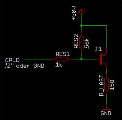 "Ist diese nun für den CPLD tötlich oder schadet es aufgrund des Widerstandes von 56K+1K nicht?" Mir ist kein CPLD bekannt, der das mitmachen würde. Die Rechnung 56K+1K geht nicht auf. Richtig ist 30V-0,6V(Basis-Emitter) also ca. immernoch 30V und einen Widerstand mit 1K. Viele Grüße TobiFlex