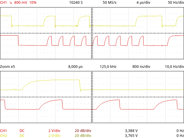 Danke der 2,7k hilft schonmal schätze etwas kleiner kann er noch sein, aber da hab ich gerade nix passendes. Obs Opencollektor ist oder PushPull kann ich leider nicht sagen ist Closetsource das Modul und die Gpios vom I2C lassen sich nicht auslesen, soweit geht es erstmal einige wenige übertragungsfehler gibt es noch, aber ich denke etwas kleinerer Pullup und die flanken sind noch ein Stück besser. THX