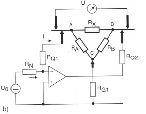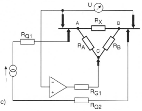 Hi, hier ein kurzer, aber sehr verständlicher Vortrag zu dem Thema: https://www.youtube.com/watch?v=MagCAtx3uok Der OP in c) ist ein Buffer. Er sorgt dafür, dass die Potentialdifferenz über RA=0V wird, daher wird hier effektiv der Stromfluss im parasitären Pfad unterbrochen. Im Prinzip der gleiche Ansatz wie bei der Messung mit Spannungsquelle. Cheerio, Marcus