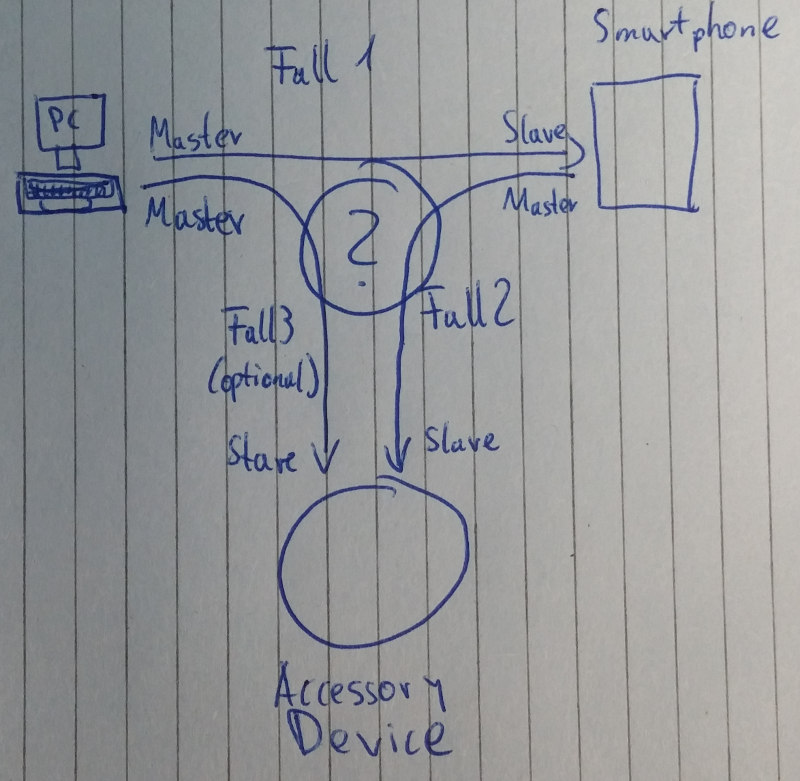 Hi, fuer ein Test-Setup mit USB Geraten und Smartphone benoetige ich eine programmierbare "USB Weiche". Ich moechte gerne einen PC, ein Smartphone und ein Smartphone USB Zubehoer Geraet miteinander kommunizieren lassen und programmatisch steuern wer gerade mit wem kommunizieren kann, also eine Art Weiche: Fall 1: PC kommuniziert mit Smartphone (spielt neue version der App auf) Fall 2: Smartphone kommuniziert mit USB Zubehoer Geraet Fall 3: (optional) PC kommuniziert mit USB Zubehoer Geraet Ich habe mir verschiedene AVR und USB Device Sharing Hubs/Switches angeschaut und festgestellt, dass die nicht so richtig funktionieren weil ich einmal das Smartphone downstream vom PC haben will und einmal das Smartphone upstream vom Accessory. Hat jemand ne Idee wich ich so ein Setup bauen kann? Viele Gruesse und Danke im Voraus, Sebastian
