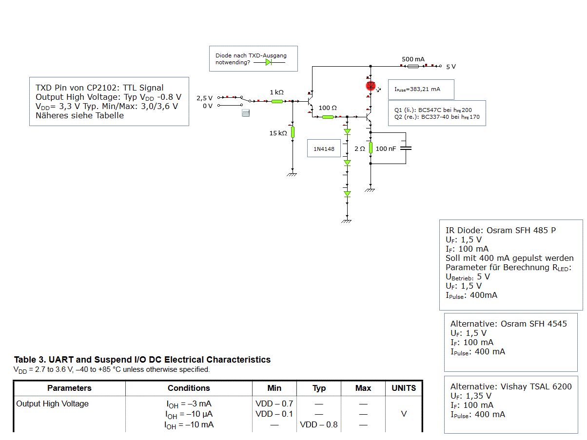 Hallo zusammen! Ich möchte meine im Wohnzimmer installierten RGB LED Leisten (i.e. Sets ähnlich wie: https://www.amazon.de/dp/B00WUCZV8W/ mit 24-Tasten-Fernbedienung) vom Windows PC aus fernsteuern. Schematisch funktioniert das Ganze bereits erfolgreich wie folgt: Softwareseitige Realisierung durch WinLIRC und simple Batch-Scripte. WinLIRC übergibt IR-Signale an USB-RS232 Schnitstelle (CP2102 Chipsatz). IR-Diode TSAL 6200 per Diode und Vorwiderstand direkt an TXD Leitung des CP2102 angeschlossen (max. 100mA chipseitig bereitgestellt). Das Vorhaben funktioniert bereits hervorragend - nur die Reichweite der IR Diode ist durch die max. 100mA arg eingeschränkt (ca. 50cm). Konkret möchte ich diese Reichweite auf praxistaugliche 3-4m ausbauen. Daher möchte ich nun eine Transistorschaltung realisieren, die meiner IR Diode einen höheren Strom zur Verfügung stellen kann. Konkret denke ich hier an 400-450mA aus dem USB Port. Darüber hinaus werde ich zwei weitere IR Dioden zwecks ihrer Reichweite ausprobieren. Da ich mich persönlich nur sehr rudimentär im Elektronikbereich auskenne habe ich keine Ahnung, welche Möglichkeiten sich mir hier alle bieten. Via Google habe ich nun folgende Schaltung gefunden die angeblich eine höhere Reichweite bietet: http://www.lirc.org/images/better_transmitter.gif Leider ist die Schaltung für andere Signalspannungen (seriell) ausgelegt worden, sodass ich sie nun für meine Zwecke abändern möchte. Dazu habe ich mich bereits eingelesen in die mikrocontroller.net-Artikel über Darlingtonschaltungen und Transistoren allgemein. Da ich allerdings nicht einschätzen kann in welchem Sättigungsgrad ein Transistor - insbesondere zwei kaskadierte Transistoren im Falle einer Darlingtonschaltung - arbeiten sollte um 38kHz modulierte IR-Signale sauber schalten zu können muss ich mich an euch wenden. Folgende Daten kann ich euch darbieten: Verfügbare Dioden: Osram SFH 485 P, Osram SFH 4545, Vishay TSAL 6200. Dioden sollen mit Vorwiderstand auf 400-450mA Strom begrenzt werden. Als Spannungsquelle dient der USB-Anschluss am Mainboard, bzw. der CP2102 Adapter der eben diese 5V des USB Anschlusses zur Verfügung stellt. Die LED-Vorwiderstände kann ich ohne Probleme berechnen. Datenblatt zum CP2102 siehe weiter unten. TXD-Ausgang des CP2102: max. 100mA. Spannung am TXD liegt Typ. bei VDD-0.8 wenn ich das richtig interpretiere wobei VDD zwischen 3.0V und 3.6V liegen kann. (Typ.: 3.3V) -> Datenblatt Seite 5. Wie muss ich nun die Transistoren und Vorwiderstände wählen, um mein Vorhaben realisieren zu können? Gibt es evtl. auch einen schlaueren Lösungsweg? Darüber hinaus zwei weitere Fragen zur oben abgebildeten Schaltung: 1. Welchen Zweck erfüllt der 100k-Ohm Widerstand der nach dem Basiswiderstand des ersten Transistors gen Erde geht? 2. Welchen Sinn erfüllen die beiden 1N4148 Dioden die nach dem Basiswiderstands des zweiten Transistors gen Erde gehen? Ich hoffe ihr könnt mir einen sauberen Lösungsansatz oder Tips geben, sodass ich meine LED Streifen bald zwecks Lichtwecker fernsteuern kann und keine Kabel bis an die Empfangsdioden legen muss. ;) Im Anhang dieses Beitrags befindet sich eine mögliche Version der Schaltung - ohne Anspruch auf Sinnhaftigkeit. Bitte gerne kommentieren! Ich bin gerne dazu bereit, anfallende Berechnungen o.ä. selbst auszuführen - möchte also nicht alles vorgekaut bekommen sondern nur Tips in die richtige Richtung. :) Vielen Dank im Vorraus! Ein schönes Wochenende wünscht Sebastian Datenblätter: CP 2102: https://www.sparkfun.com/datasheets/IC/cp2102.pdf SFH 485 P: http://www.produktinfo.conrad.com/datenblaetter/150000-174999/153831-da-01-ml-IR_EMITTER_SFH485P_T1_3_4__OSR_de_en.pdf SFH 4545: http://www.produktinfo.conrad.com/datenblaetter/525000-549999/525218-da-01-ml-IR_EMITTER_5MM_SFH4545_de_en.pdf TSAL 6200: http://www.produktinfo.conrad.com/datenblaetter/150000-174999/171140-da-01-en-IR_SENDEDIODE_TSAL_6200__VIS.pdf