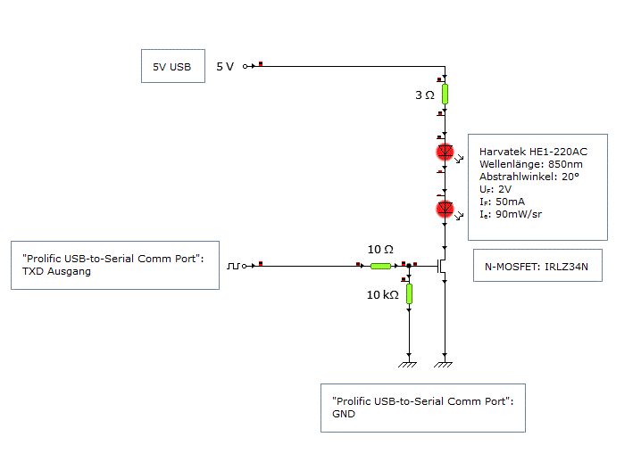 Problem gelöst! Nach endlosen Versuchen habe ich das Übel gefunden: meine USB-to-Serial Schnittstelle hat den reibungslosen Ablauf verhindert. Ein Auslöser, den ich mangels Alternativen nie in Betracht gezogen habe. Symptomatik: Verwendeter MOSFET (IRLZ34N) hat stets durchgesteuert, die IR-Emitter haben immer geleuchtet. Signalreichweite <1m. Auch ein Vorwiderstand auf dem Gate und ein zum GND geschalteter 10k-Ohm Widerstand wussten das Problem nicht zu beheben, sodass ich zunächst einen defekten MOSFET vermutet habe. Nachdem ich nun auf einen anderen USB-zu-Seriell Adapter umgestiegen bin (Prolific Chipsatz) funktioniert mein IR Emitter einwandfrei. Nach mehreren Versuchsaufbauten die sich als nicht zufriedenstellend oder überladen erwiesen haben, habe mich nun der Einfachheit halber für den von dir, Arno, vorgeschlagenen Aufbau entschieden. Als MOSFET habe ich den IRLZ34N verwendet. In der Drainleitung sitzen zwei in Reihe geschaltete IR Emitter sowie ein 3-Ohm-Vorwiderstand. Daten zur IR-Diode: Harvatek HE1‑220AC Wellenlänge: 850nm Abstrahlwinkel: 20° UF: 2V IF: 50mA Ie: 90mW/sr Vielen Dank für eure zahlreichen Inputs!