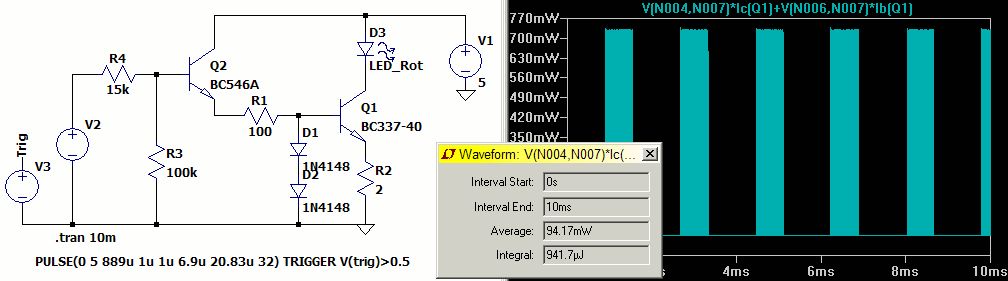 Hi, Lurchi schrieb: > Ein BC237 wäre etwas kleine - sollte wohl BD237 heißen. Ganz so groß > muss nicht, aber so etwas wie BC635 / BD135 sollte es schon mindestens > sein. Jo Tippfehler, meinte BC337. Wenn man mal den RC5 Code anwendet, entstehen 100 mW. Statisch kann man diese Schaltung damit aber nicht betreiben. Dann muss es ein BD135 sein. Grüße
