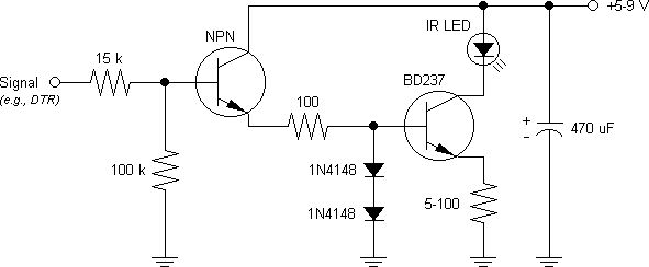 Felsentreu zeigte: Darlington_Schaltung_fuer_Infrarot_Diode.gif Hi Krangel, warum nicht einfach einen Emitterfolger direkt an das Eingangssignal und die IR-LED mit einem Vorwiderstand in die Emitterleitung? Man spart etliche Bauelemente und viel Strom bei höherer Schaltgeschwindigkeit.