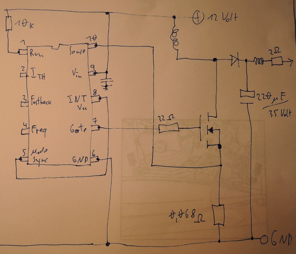 In einer industriell gefertigten Schaltung eines namhaften Herstellers wird mittels des Stepup-Reglers LTC-1871-7 aus 12 Volt 31 Volt generiert und damit 10 LEDs in Reihenschaltung betrieben. Das funktioniert, aber nach geschätzt 0,3 sec schaltet der Regler aus, sehr wahrscheinlich wegen Überspannung. Bild 1 zeigt einen Überschwinger auf geschätzt über 40 Volt, was alleine schon von den 35 Volt des Ausgangs-Elkos ungut ist. Das IC stellt seine Arbeit komplett ein, auch der Oszillator ist aus. An seinen 4 Steuereingängen liegen die in der Handskizze eingetragenen Spannungen an, allesamt zu niedrig. Der Fehler muss in der Ansteuer-Schaltung liegen, einem Haufen an SMD-Bauteilen, für den es noch keinen Schaltplan gibt. Wegen des schnellen Ausschaltens sind "normale" Messungen illusorisch. Ein digitaler Speicher-Oszi ist zwar vorhanden. Der ist aber so neu, dass noch keine Praxis besteht. Mit welchen Strategien sollte man die Fehlersuche betreiben? Grüße, wilhelmT