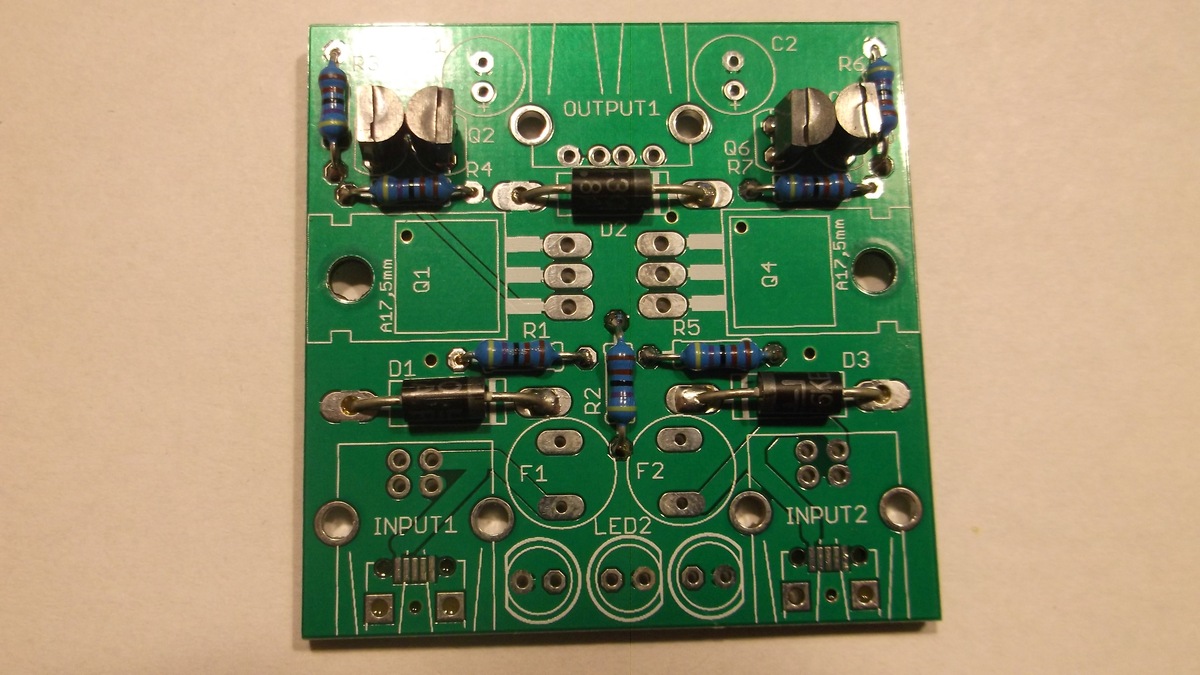 Oder du kannst ein "Redundanzmodul" benutzen. Habe mir so eines gebastelt :-D Es sind im Prinzip 2 "ideale Dioden" mit Überspannungsschutz und getrennter Absicherung. Es sind 3 Led vorhanden, welche über die 2 Eingangsspannungen und die Ausgangsspannung Bescheid geben. Der Spannungsabfall beträgt 80mV. Es gibt keine Rückspannung, wenn nur ein Eingang angeschlossen ist. Meine "Akkupackschaltung" habe ich auch mal grob skiziert. Für 16€ kannst du einen Bausatz von mir erwerben. Einfach eine PN, dann geht das Ding morgen raus ;-) Wie das Ding aussieht, kannst du den Bildern entnehmen.