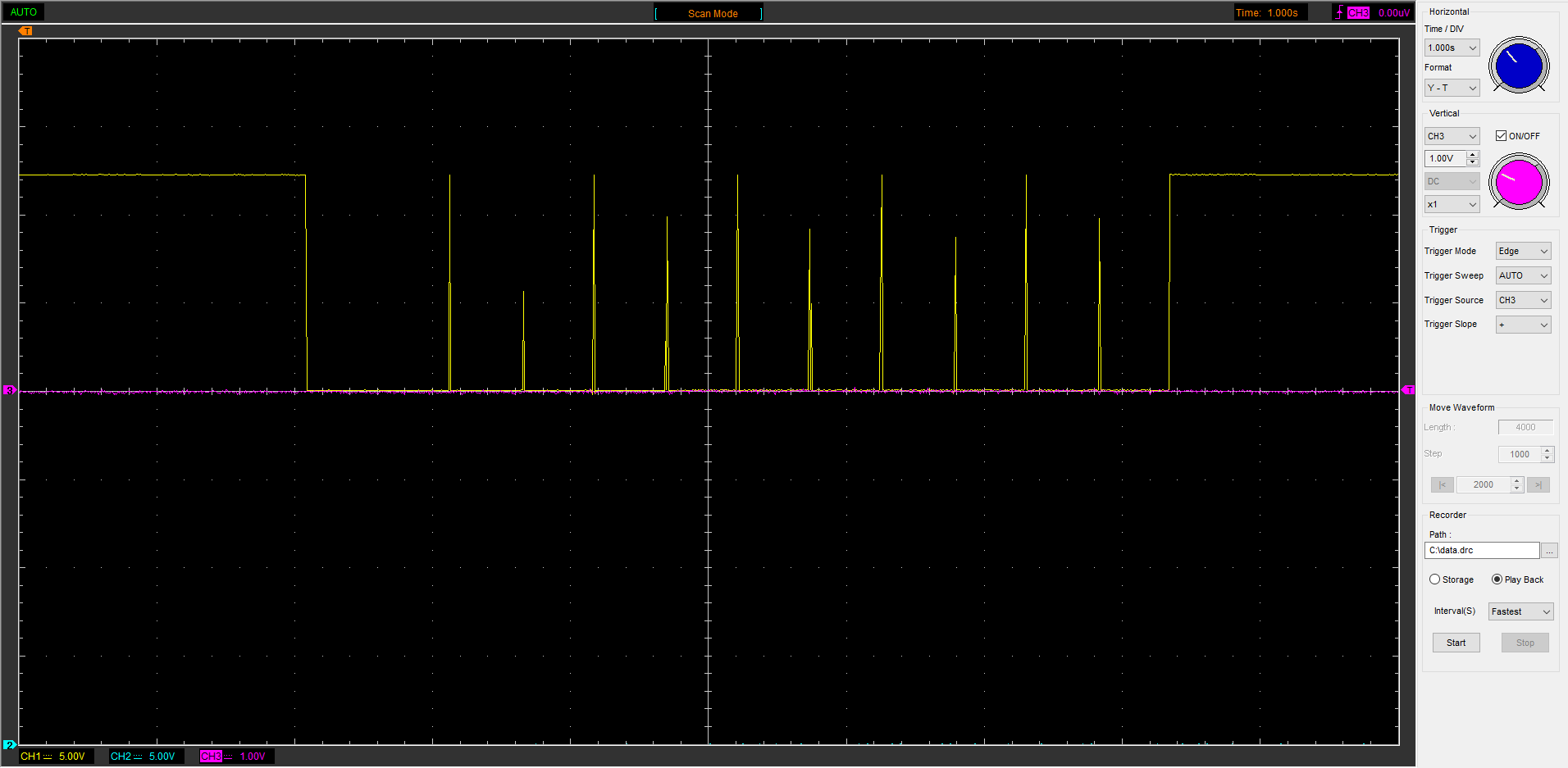 Thomas E. schrieb: > Sascha F. schrieb: >> wo könnte ich den Fehler den noch suchen ? > > Vor Allem: systematisch suchen! Guck Dir erstmal die Versorgungsspannung > des AVRs an, dann das Signal am Port (PD4). So regelmäßig, wie die > Signal-Peaks kommen, scheint mir das eher ein Software-Problem zu > sein... Grün ist die Versorgungsspannung nach dem Stepdown Modul .... Also OK Lila, PD4 du scheinst recht zu haben das es ein Programm Fehler sein könnte, das werde ich jetzt als nächstes checken, beim Überfliegen vom Code, konnte ich aber nix finden (Wie gesagt überflogen)