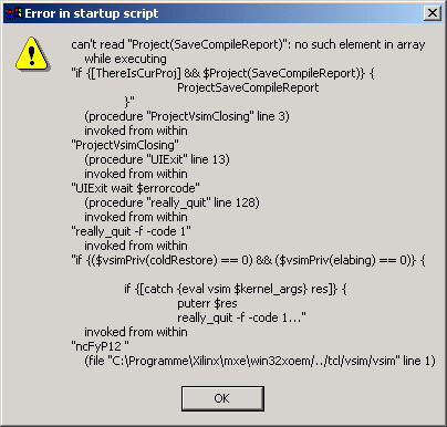 ich hätte wohl nur XST updaten sollen, nicht auf MXE 6.0d. Jedenfalls bekomme ich diese hilfreiche Error Meldung und mxe beendet sich dann (nack OK klick). Habe schon im Temp.dir alles gelöscht, unter eigene Datein das hte Verz. - es half alles nichts. Im Progamme/xilinx.... habe ich keine Schreibrechte (arbeite als non-admin), darin kann er sich also nichts gemerkt haben. Das Problem begann, als ein TCL Error kam und ich mxe per Taskmanager abschiessen musste. Zwischendurch ein anderes Projekt File öffnen klappt, ist aber keine Lösung, da bei neuen Projekten ein anderer TCL Error kommt. Irgendwelche Ideen, wie ich mxe wieder bändigen kann? Viele Grüße Olaf