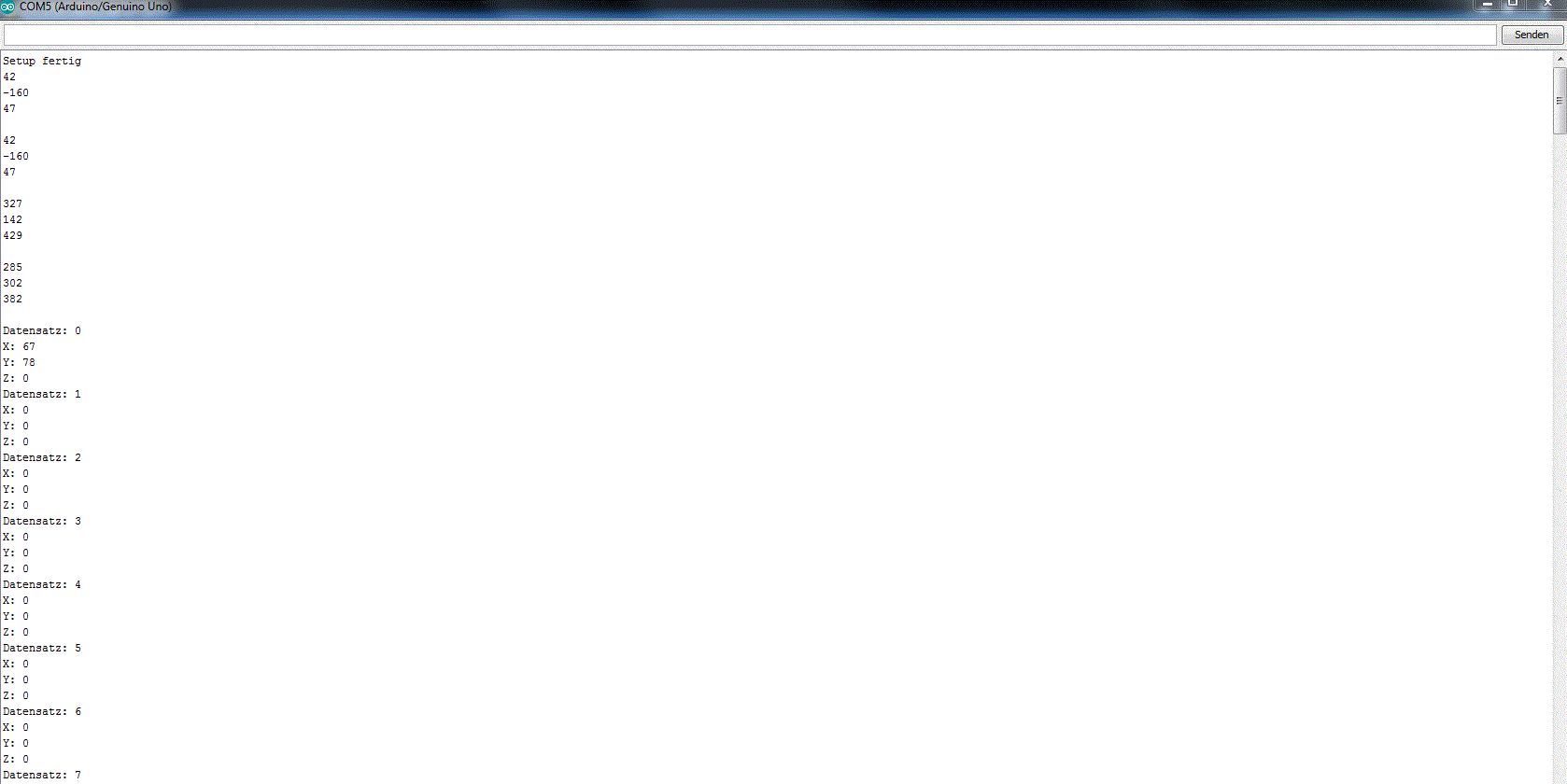 Hallo zusammen, ich versuche mich gerade an der Programmierung eines Arduino Uno´s der einfach nicht machen will was ich ihm (falsch) sage :) Was ich machen möchte: An den Controller wird ein 3-Achsen-Beschleunigungssensor angeschlossen. Ich möchte damit die Geschwindigkeit einer Pressen Kolbenstange bestimmen. http://www.mikroe.com/add-on-boards/measurement/three-axis-accelerometer/ Die Schleife wird aktuell nur einmal durchlaufen. Später möchte ich diese mit zwei Endlagenschaltern im kompletten Hubzeitraum auswerten. Die Werte werden dann in den EEPROM abgespeichert und bei Gelegenheit mit dem Laptop ausgelesen Nun zu meinem Problem: Die Werte die aus dem EEPROM an die serielle geschickt werden unterscheiden sich stark zu den eingelesenen. Wieso ist das so? Außerdem habe ich das Problem das ich manchmal den Befehl "start" zum einlesen der Sensorwerte drei oder vier mal senden muss bis der Controller mit antwortet, obwohl dieser aber bei der LED Rx jedes mal aufblinkt.... Das gleiche auch beim Befehl zur Datenausgabe.... Da ich leider keine Ahnung habe wie ich hier einen Quellcode anfügen kann, habe ich den Sketch und ein Bild der Ausgabe des Controllers in den Anhang eingefügt. Ich hoffe ihr könnt mir helfen.