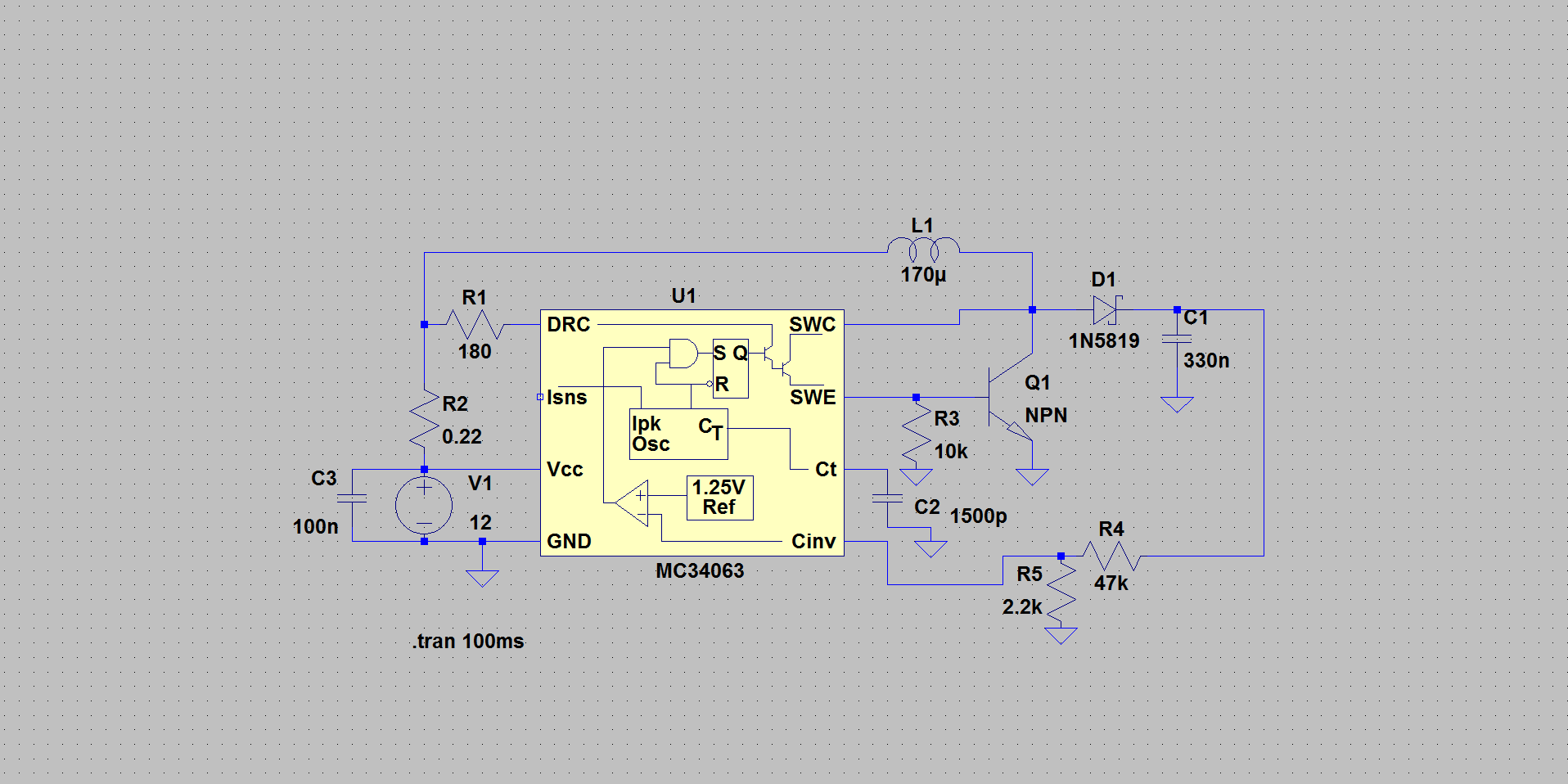Hey! Ich möchte mir eine Konstantstromquelle auf Basis des MC34063 aufbauen. Damit das klappt, versuche ich gerade, die Grundschaltung des Datenblatts (Seite 5/Seite 6) nach zu bauen. Das Problem ist: Es klappt nicht. Laut Datenblatt sollten da 28V heraus kommen, ich habe aber einen 120V Spike und dann Abklingen auf 27.78V Ich würde jetzt natürlich mit den Parametern rumspielen, aber da ich diese direkt aus dem Datenblatt übernommen habe, frage ich mich was da das Problem ist? Tatsächlich habe ich die Beispielschaltung mit externen Transistor genommen und die Werte aus dem Beispiel ohne Transistor (weil es nur da Werte hat), jedoch sollte ein externer Transistor ja weder die Spule noch die Siebelkos beeinflussen, oder? Noch eine Frage zum Abschluss: Der IC kann zwar 1.5A und ich brauche nur 1A, aber zwecks Kühlung und "besserem Gefühl" wollte ich da 'nen 15-20A MOSFET hinsetzen. Macht das Sinn? PS: Ich habe die Simulation immer nach ein paar Sekunden/Minuten mit ESC gestoppt (weniger Iterationen für weniger Genauigkeit), weil sie sonst Jahre rechnen würde. Noch ein Fehler?