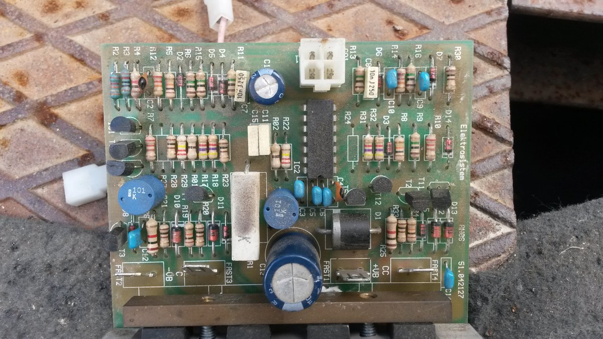 Diese Platte schaltet die Lenkung einer von 24V Gleichstrom angetriebenen Arbeitsbühne. Die hat letzthin immer wieder Aussetzer. Wenn ich sie für 5 Minuten ausschalte, geht sie meist wieder, auch wenn man schnell links-rechts schaltet. Die Stromversorgung passt, aber die Ausgänge zeigen dann nur noch Bruchteile von einem Volt. Es funtioniert weder links- noch rechts-Einschlag. Deshalb denke ich, eines der nicht paarweise vorhandenen Bauteile könnte langsam den Geist aufgeben. Ich habe versucht, den großen Widerstand zu messen, da sinkt der Wert am Mulitmeter mit der Zeit. Kann mir jemand helfen und einen Tipp geben, was da kaputt sein könnte? Ganz unten nicht mehr ganz zu sehen sind 4 Transistoren mit Kühlelement. Es scheint ja ein einfaches Bauteil zu sein, kostet aber eine Menge, da es nie in großer Anzahl hergestellt wurde. Gruß Joachim
