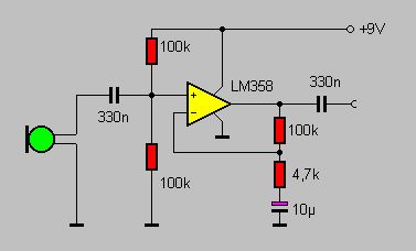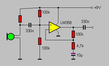Elektretmikrofone benötigen eine Versorgungsspannung, die du in deiner Schaltung mit einem zusätzlichen Widerstand von +9V zum positiven Ende des Mikros legen kannst. Ein 4,7k - 8,2k Widerstand sollte hier richtig sein. derwisch war schneller - dafür icke mit Bildchen :-P