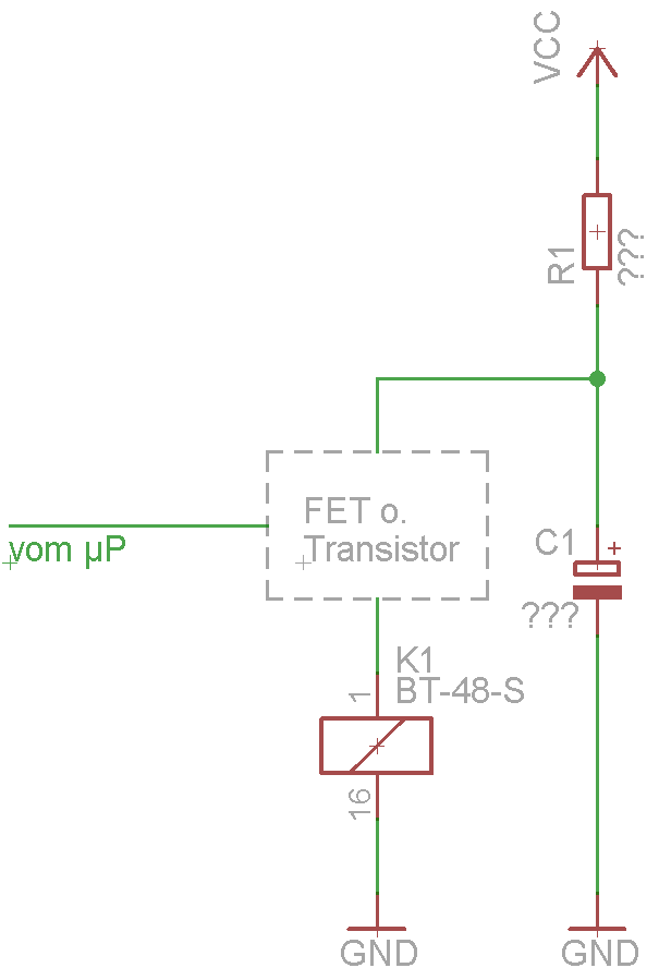 @ Amateur (Gast) >Wie wäre es mit der angehängten Schaltung? Prinzipiell OK, das kann man aber einfacher machen, wenn man den Transistor auf Masse und das Relais nach "oben" legt. >Der Widerstand ist etwas schwieriger. Nö. >1. Das Relais sollte sicher gehalten werden. Wurde doch schon mehrfach genannt, 0,4UN. Sas ist ein einfacher Spannungsteiler. Der Widerstand der Spule steht im Datenblatt. >Die übliche Diode habe ich noch in der Schublade. Dann bau sie besser ein, denn in der Schublade schützt sie deinen Transistor nicht ;-)