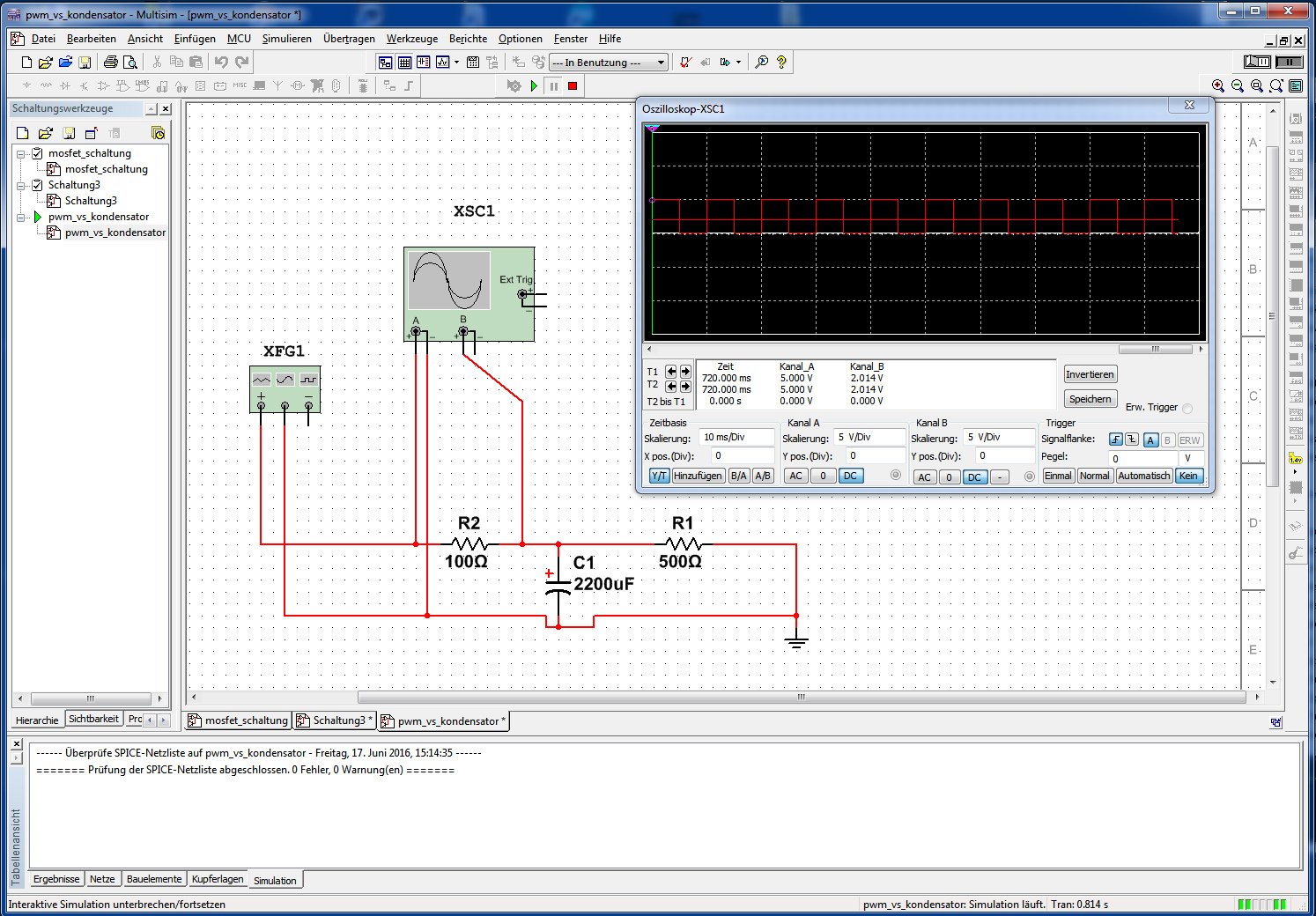 Hallo, ich benütze einen Hameg HM 8080-4 Funktionsgenerator. Eingestellt habe ich auf 0.1V - 4V in einer Rechteckschwingung. Gemessen am Oszilloskop Siehe Bild 1 (Gelb) und dann wenn ich auf 50mV skaliere, sieht man sowohl im positiven als auch im negativem Bereich Störungen. Ich weiss jetzt nicht ob das am Oszilloskop liegt oder ob dass in der Praxis wirklich so ist aber die Frage ist: Kann das einen ELKO beschädigen ? Wenn ja, wie schnell ? Wieviel Strom kann so ein Hameg Funktionsgenerator geben ? Ich möchte damit ein MOSFET ganz schnell ein und ausschalten. Und zwar so schnell, dass der MOSFET gar nicht mehr mit kann. Damit ich am Oszilloskop sehen kann wie das aussieht. Das würde aber wahrscheinlich am Gate viel Strom ziehen? Kann ein Funktionsgenerator dabei kaputt gehen ?