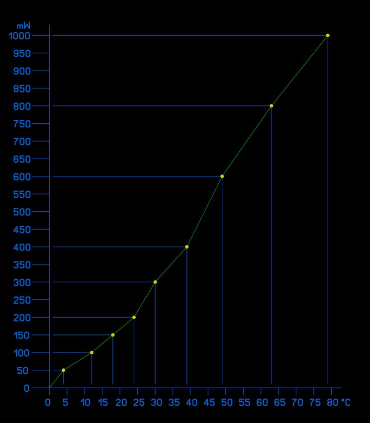Datenblätter sind, mangels ausreichender Englischkenntnisse, immer so ein bisschen ein rotes Tuch für mich. Deshalb ja auch meine etwas "doofe" Frage. Heute Morgen habe ich mir aber die Mühe gemacht, und auf der Steckplatte mit einem 7805 und dessen Erwärmung bei Belastung experimentiert. Ich habe ein Diagramm erstellt, dass meine Messwerte ergeben haben. Verlustleistung in mW vertikal, Temperaturerhöhung in °C horizontal. Diagramm anbei. Nochmals vielen Dank für eure Hinweise ;-) lg, Jonny