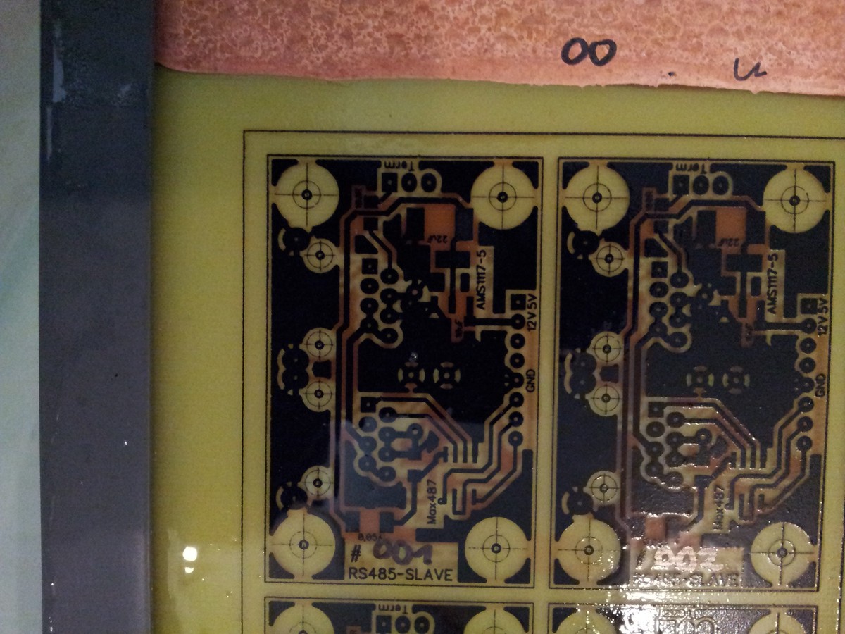 Hallo, liebes Forum. Nachdem ich hier schon seit über einem Jahr kiebitze habe ich heute beschlossen, mich anzumelden und mit Euch meine neueste "Erfindung" zu teilen. Ich habe das Forum durchsucht und nichts Vergleichbares gefunden. Was mich wundert. Vielleicht kam ich auf die Idee, weil ich sehr viel X-Over unterwegs bin, ich meine, weil ich schon die uterschiedlichsten Berufe hatte :) Ich suchte schon lange die optimale Verfahrensweise um mir meine Platinen selbst zu ätzen. Ätzservice wurde auf Dauer einfach zu teuer und die Wartezeiten und die damit verbundene Spannung waren ebenfalls nicht zu ertragen. Ich habe einen HP P1006. Der war sehr billig und ist eigentlich für den Zweck nur bedingt geeignet. Es lässt sich z.B. die Tonerdichte nur über den Kauf der Tonerpatronen steuern: Original zu teuer, billig zu billig. Als Laminator habe ich einen HAMA A4 (ca 35 Eu) leicht modifiziert. Ich habe die Temperatursensoren mit Abstandshaltern ca 5...7 mm weiter von ihrer Messstelle entfernt. Funktioniert. Das Papier: Für Manche eine Frage der Philosophie. Meine ersten Versuche mit R--Katalogpapier habe ich abgebrochen. Zu umständlich (erst aufkleben, drucken) und durch den Text, der da irgendwie immer schon drauf ist, ist es fast unmöglich, Vorder- und Rückseite sauber aufeinander zu legen. Ich mache ausschließlich Double-Sided. Dann habe ich mir ein spezielles TonerTransfer-Papier gekauft. Das hat auf einer Seite eine PTFE(?)-Beschichtung. Super Druckbild, aber nur für einseitige Platinen geeignet, da es sich mit keinem mir bekannten Kleber auf der PTFE-Seite verbinden lässt. Als nächstes versuchte ich verschiedene Laser-Color-Papiere. Die meisten waren zu dick. Probleme mit der Wärmeübertragung und beim Ablösen haben diese Testreihe zum Scheitern gebracht. Es folgte noch eine lange Reihe von teilweise ganz erfolgreichen Versuchen, mit deren Beschreibung ich Euch aber nicht weiter langweilen will. Das Hauptproblem blieb aber immer das Gleiche: Wie entferne ich das Papier von der Platine ohne den Toner zu beschädigen und ohne blutende Fingerkuppen. De Lösung habe ich vor einer Woche gefunden: Spucki-Papier. Das ist ein weißes, dünnes, ungestrichenes (unbeschichtetes) Papier, welches auf einer Seite mit einem wasserlöslichen Kleber beschichtet wurde. Ich habe auch einen Lieferanten gefunden. Hier ein Ausschnitt aus meiner Dankes-E-Mail: Zitat: Heute lagen die Proben im Kasten. Freu freu. Hatte ich nicht gesagt EIN Bogen pro Sorte? Wenn mich mein laienhaftes Auge und Fingerspitzengefühl nicht trügt, ist das alles die gleiche Sorte? Jedenfalls habe ich sofort einen Test gemacht. Und da Sie ordentlich eingepackt haben, konnte ich gleich großzügig ein echtes doppelseitiges Projekt testen. Bedrucken: Einwandfrei (als ich endlich festgestellt hatte, wie man die richtige Seite bestimmt: im Kleber hinterlässt der Fingernagel leicht Kratzspuren!) Auflaminieren: Perfekt. Das Papier ist schön dünn, man kann also auch durch sehen und Vorder- und Hinterseite prima übereinanderlegen und dann auch noch einfach zusammenkleben. Die Hitze vom Laminierer geht super durch das dünne Papier und erreicht den Toner fast ungedämpft. Klasse! Abweichen: Bisher musste ich mindestens eine viertel Stunde in warmem Spülmittelwasser (wir im Osten sagen immer noch Fitwasser) einweichen und dann vorsichtig rubbeln bis die Fingerkuppen keine Abdrücke mehr hatten. Beim Versuch mit Ihrem Muster traute ich meinen Augen nicht: Nach nicht mal 5 Minuten schwammen die Papierlagen lose im Wasser herum. Erst erschrak ich: Mist, was falsch gemacht.... Nein. Der Toner klebt bombenfest auf dem Kupfer und die Konturen sind messerscharf. Und die Kleberreste - falls überhaupt vorhanden - einmal mit dem Schwämmchen und gut. Mit viel Rubbeln ist jetzt Schluß!!! Herzlichen Dank für die große Freude, die Sie mir heute bereitet haben :) Ich nehme erstmal 200 Blatt von dem Papier, dessen Namen ich nicht weiß. Mehr wäre ungünstig: Ein Tropfen Wasser und der Stapel ist im Eimer. Zitat Ende. Ich habe die Leute noch gefragt, ob ich das weitergeben darf. Hier bitte: Das Papier heißt Polygum und kostet 0,10 Eu/A4-Bogen FELIX-FECHENBACH-KOOPERATIVE www.fechenbach.de Auf den Fotos kann man sehen, daß der Laminierer zu heiß war, der Toner ist etwas verlaufen. Auch die Masseflächen sind etwas porös. Das liegt aber an meinem Sch... Drucker. Beste Grüße DRESI