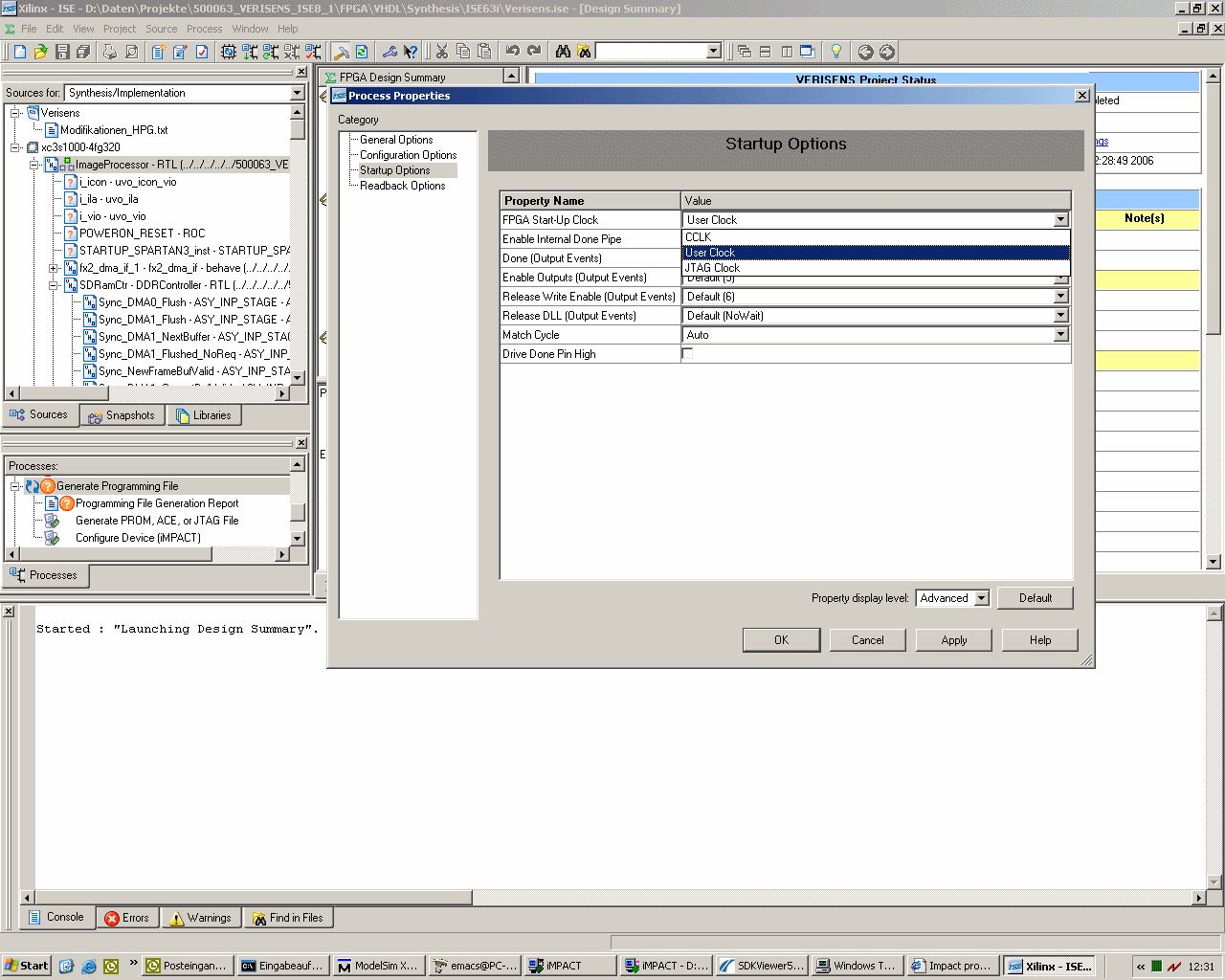@FPGAküchle ich nutze impact 8.1. und das digilent-board und habe wohl gleiches problem ... ?.bit ist kein problem auf dem board ablaufen zu lassen die ?.mcs erstelle ich aus der ?.bit mit impact, andere option war mir nicht aufgefallen wenn ich das richtig verstanden habe brauche ich ?.mcs files für den Platformflash er läd die auch ..allerdings nur mit abgeschalteten verify und das programm startet nicht nach einschalten ?? > Da war der startUp clock auf Jtag gesetzt. Setze ich > beim Generieren des Bitfiles den startupclk auf cclk (sollte default > sein), klappt alles wunderbar. ? wo genau finde ich diese option ? wie gehe ich vor