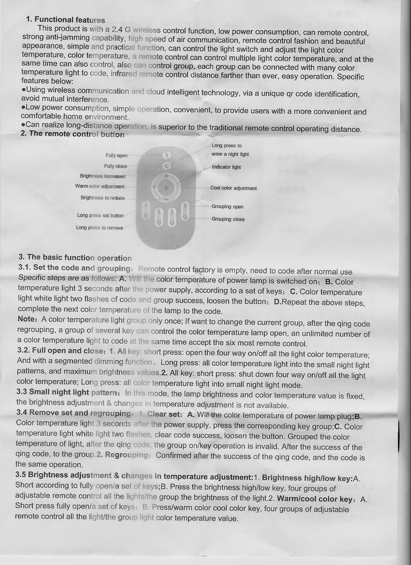 Oh Gott... die können so gut Englisch, wie Du... 3. Die grundlegenden Arbeitsfunktionen 3.1. Codierung und Gruppierung einstellen die Fernbedienung ist ab Fabrikation leer, muss programmiert werden nach Erwerb (eigentlich steht hier "nach normalem Gebrauch"). Folgend werden die genauen Schritte gezeigt: A. Wird die Farbtemperatur der Leistungslampe wenn angeschaltet; B, Farbtemperatur leuchtet drei Sekunden nach der Stromversorgung, abhängig von einer Anzahl Tasten; C. Farbtemperatur leuchtet das weiße Licht zwei mal Blinken von Programmierung und Gruppierungserfolg, Taste loslassen.... Also ich geb's auf...