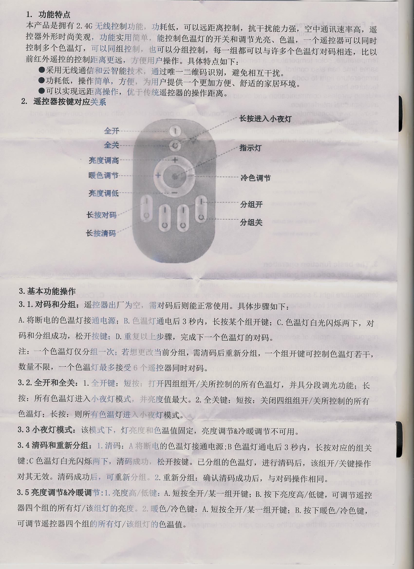 Hallo an das wissende Forum, ich hatte mir kürzlich LED-Deckenleuchten in der Bucht bestellt und zwar zwei von dieser: http://www.ebay.de/itm/Wifi-Musik-dimmbar-Lampe-Deckenlampe-36W-LED-Deckenleuchte-mit-App-Fernbedienung-/331885589940?&autorefresh=true Beide haben je eine 2.4 GHz Fernbedienung und sollen an die Decke eines Zimmers montiert werden und dort, wenn möglich, mit nur einer FB zusammen gesteuert werden. Der beigelegte Zettel (nennt sich hochtrabend "User Manual") beschreibt irgendwas mit chin. Schriftzeichen und die Rückseite kommt mit einer Art Englisch daher, wie von mir angehangen, ich aber nicht kapiere. Das Doofe ist, englisch hatte ich nie gelernt, eher russisch. Meine aber, da ich unter Punkt 3.1 etwas von "grouping" lesen kann, dass evtl. eine Gruppensteuerung (von Leuchten) mit einer FB vorgesehen ist. Derzeit reagiert eine Leuchte nur auf das Signal der dazu gehörenden FB, die andere Leuchte bleibt unbeeindruckt. Vielleicht ist jemand so nett und schaut sich den Anhang mal an und könnte mir Hinweise geben, wäre super. :-) Wolfgang, der mit dem Leuchtenproblem, danke im Voraus.