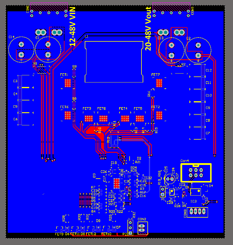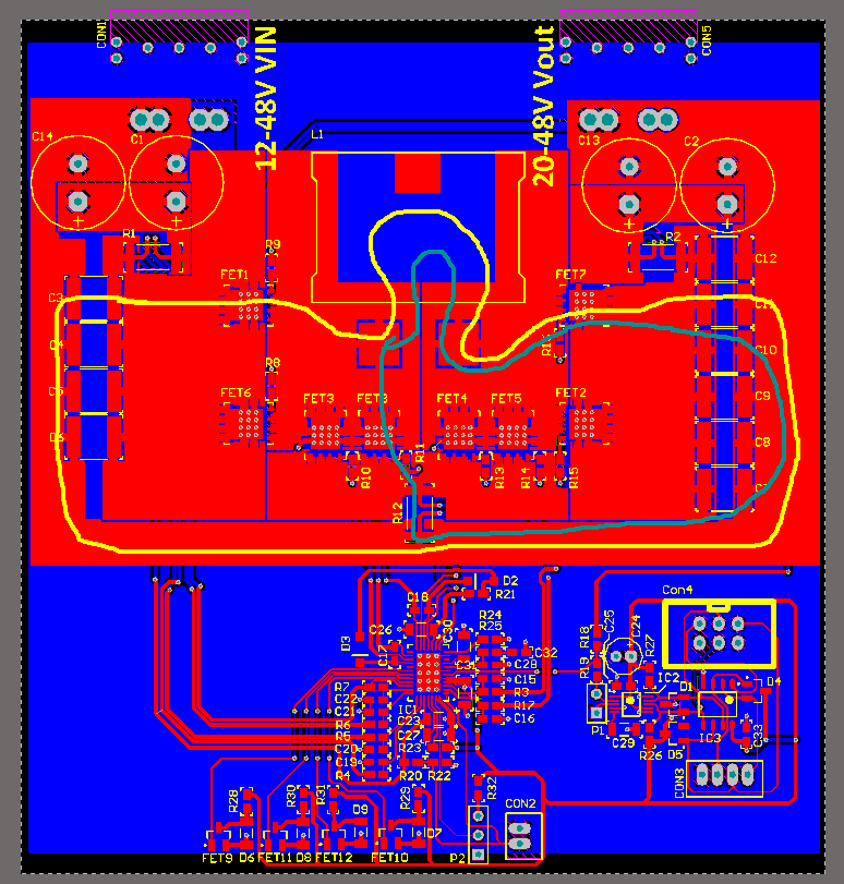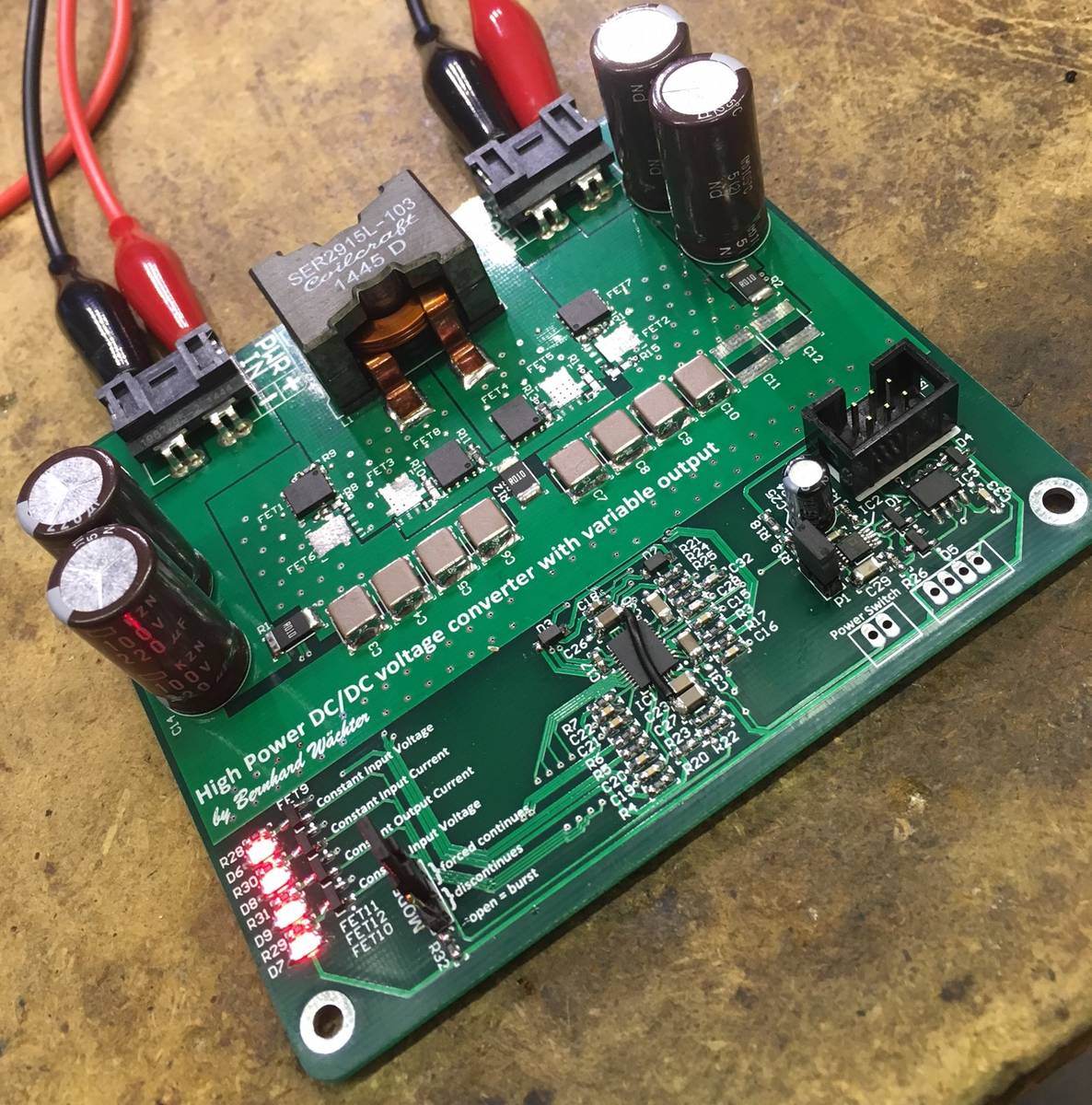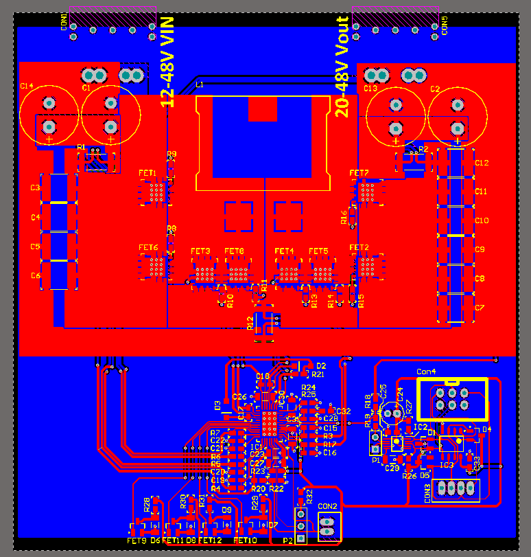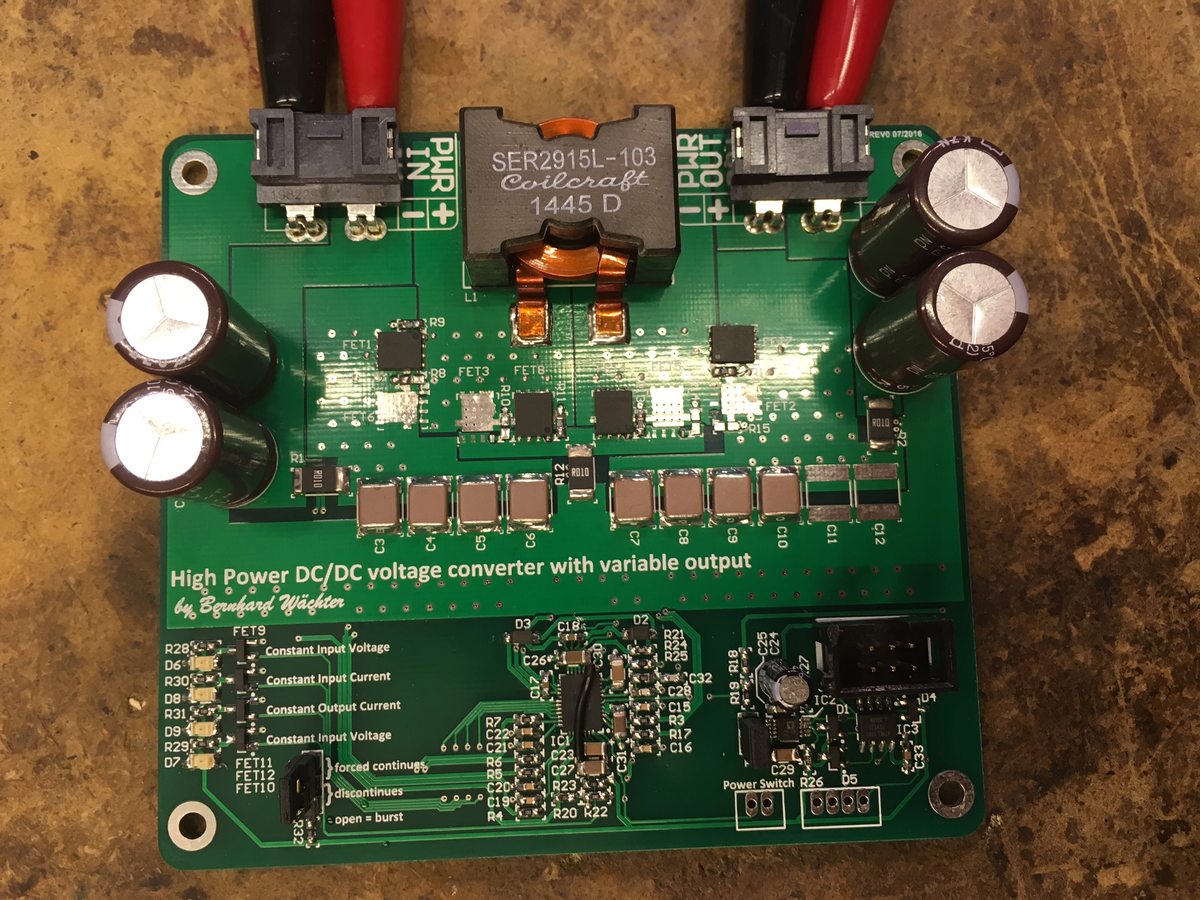 Platine liegt nun hier auf meinem Tisch, wurde getestet und läuft!! 250W bei 18V in -> 48V out sind mit vier Mosfets kein Problem. Die Fets und Spule werden gerade mal handwarm. Läuft sehr stabil das Ganze. Spannung wird über I2C und einen AD5274 gesteuert. Auf der Platine befindet sich ein Attiny, drei seiner Pins sind über eine Buchse nach außen geführt. Es kann also bequem ein kleines Programm geschrieben werden um über externe Pins die Spannung zwischen 17 und 48V einzustellen. Das Programm kann bei Bedarf auch ich schreiben. Eine ISP Buchse befindet sich ebenfalls auf der Platine. Einziges Manko: es wurde eine Verbindung im Layout vergessen (muss mit einem kurzen Stück Kabel verbunden werden) und die PullUps der LEDs fehlen. Die LEDs zeigen an ob Ein- bzw. Ausgang im CC oder CV Mode arbeiten. Ohne die Pullups leuchten sie immer. Hat jemand Interesse an der bzw. den Platinen? (hab 5 Stück) Gruß Bernhard
