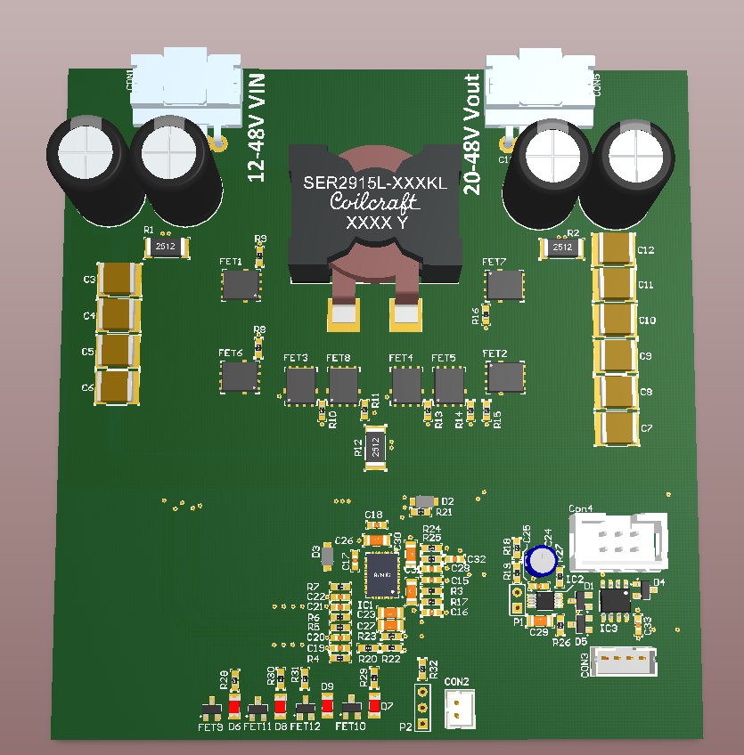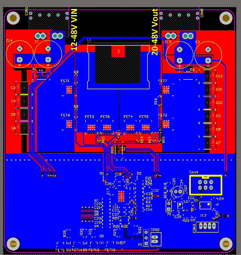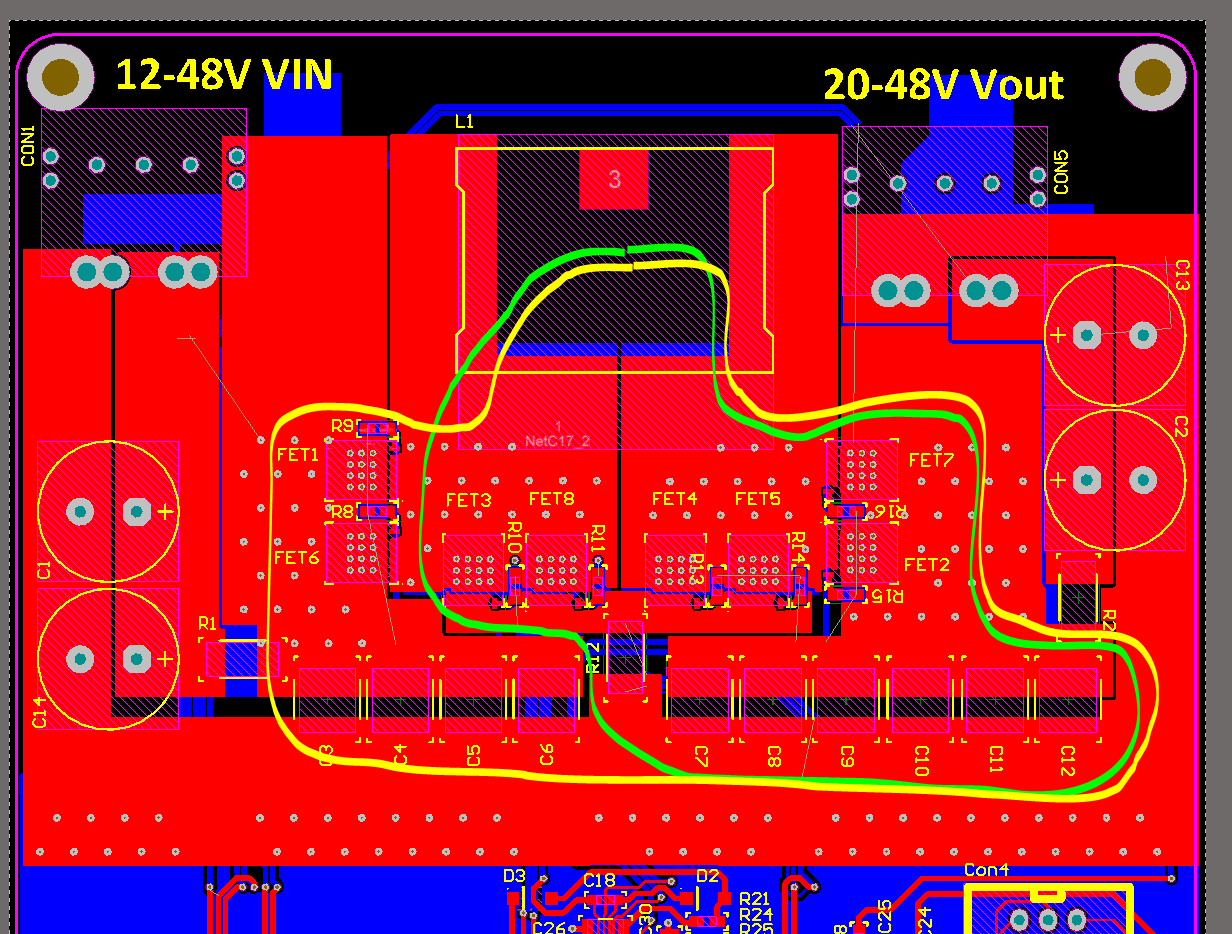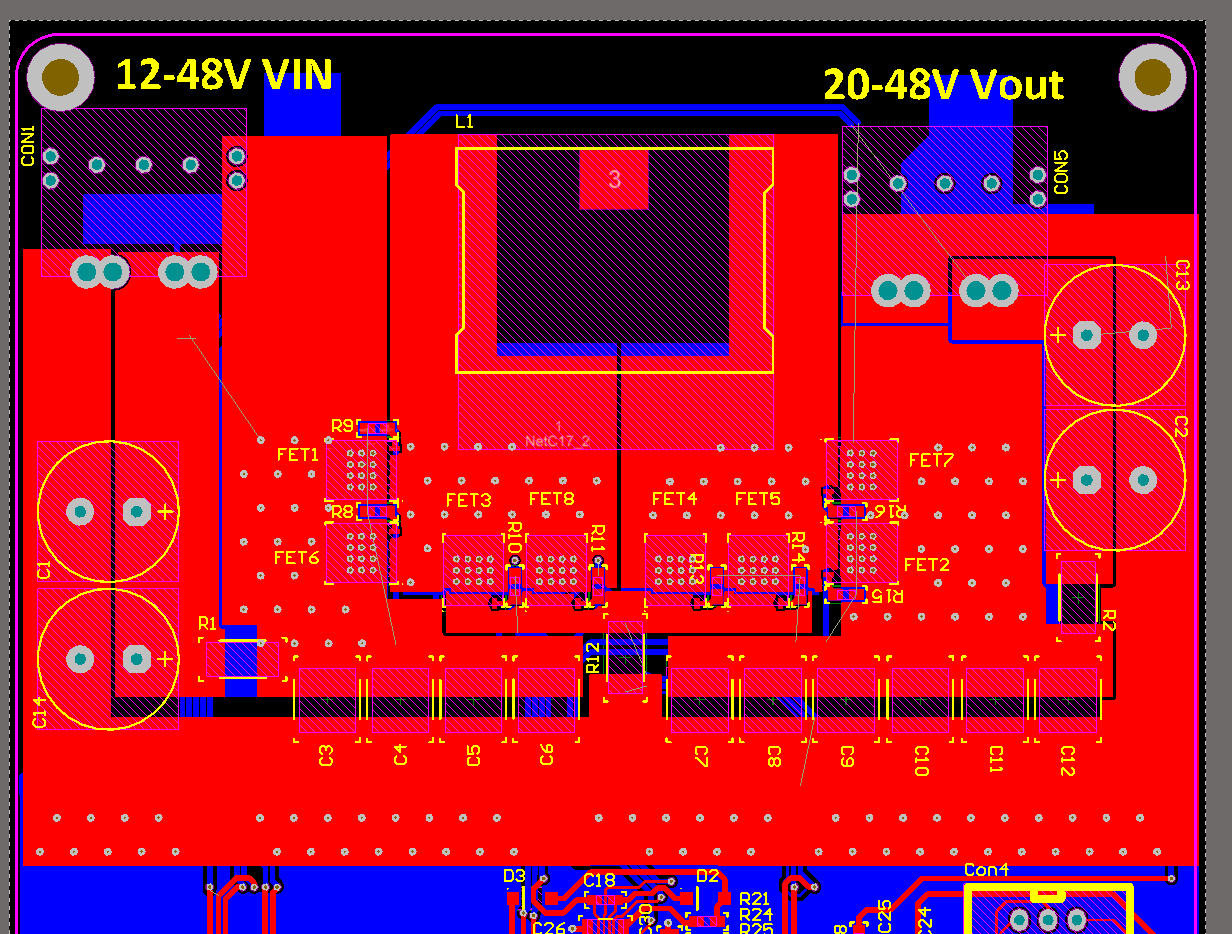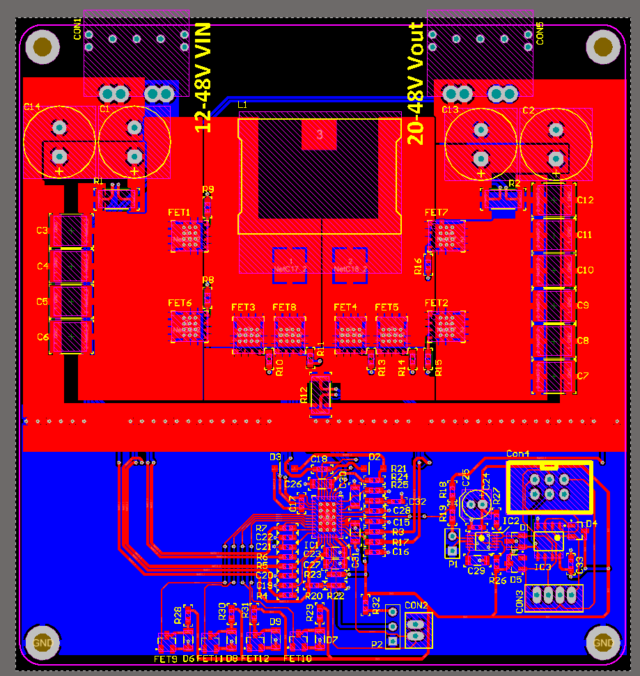 Platine liegt nun hier auf meinem Tisch, wurde getestet und läuft!! 250W bei 18V in -> 48V out sind mit vier Mosfets kein Problem. Die Fets und Spule werden gerade mal handwarm. Läuft sehr stabil das Ganze. Spannung wird über I2C und einen AD5274 gesteuert. Auf der Platine befindet sich ein Attiny, drei seiner Pins sind über eine Buchse nach außen geführt. Es kann also bequem ein kleines Programm geschrieben werden um über externe Pins die Spannung zwischen 17 und 48V einzustellen. Das Programm kann bei Bedarf auch ich schreiben. Eine ISP Buchse befindet sich ebenfalls auf der Platine. Einziges Manko: es wurde eine Verbindung im Layout vergessen (muss mit einem kurzen Stück Kabel verbunden werden) und die PullUps der LEDs fehlen. Die LEDs zeigen an ob Ein- bzw. Ausgang im CC oder CV Mode arbeiten. Ohne die Pullups leuchten sie immer. Hat jemand Interesse an der bzw. den Platinen? (hab 5 Stück) Gruß Bernhard