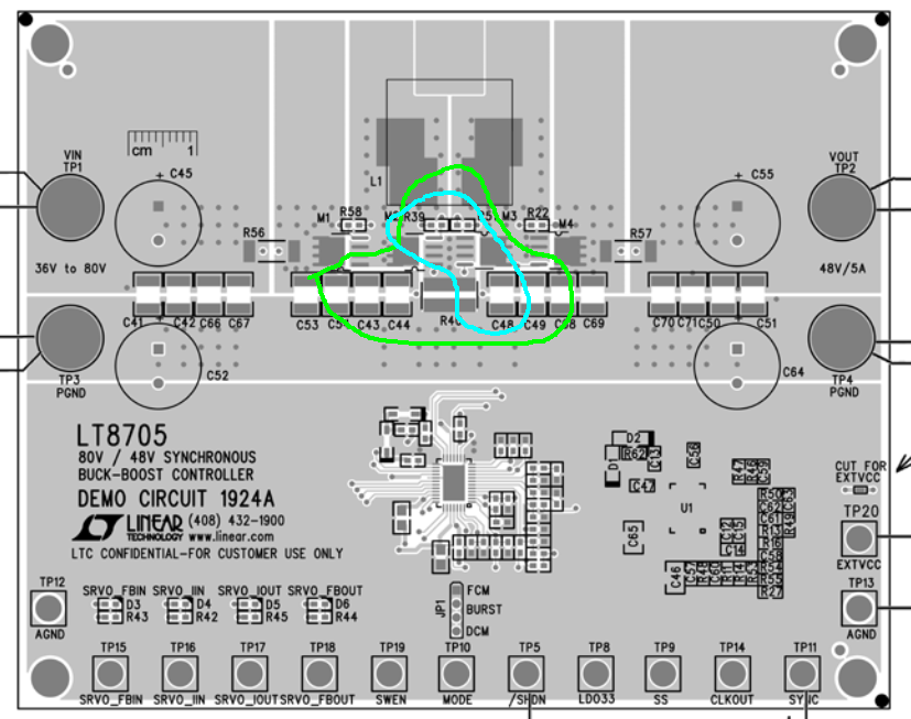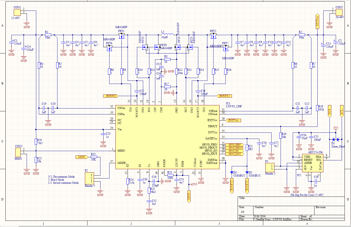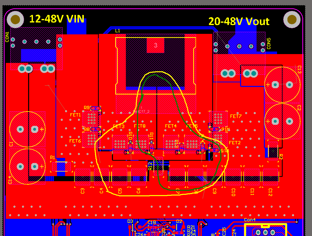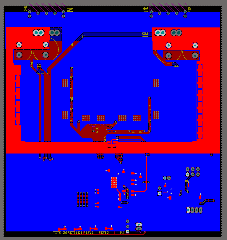 Guten Abend zusammen, ich designe gerade einen LT8705 Schaltregler mit 12-48V IN -> 20-48V OUT. Ausgangsstrom bis zu 10A Spitze. Die Ausgangsspannung wird über einen µC und Digitalpoti gesteuert. Design liegt im Anhang. Ich habe versucht die stromführende Masse von der Steuer Masse zu trennen. Jetzt frage ich mich allerdings wie man den LT8705 am besten anbindet? Anbieten würde sich die Masse rund um R12, also dort mit Vias auf GND runter. Jedoch ist ja gerade das der unruhigste Punkt. Hauptsächlich mache ich mir Sorgen um den Rückstrom der Gateleitungen. Wie sieht ihr das? Gruß Bernhard EDIT: was mich gerade noch auffällt: Ich habe die Thermal Planes für die Fets auf Bottom vergessen...