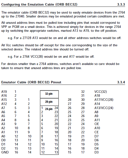 Hi, ich habe einen 'Stag Orbit32' Programmer. Das auslesen und Brennen von Eproms klappt problemlos, nun würde ich allerdings gerne auch die Emulation-Funktion verwenden. Leider habe ich das originale Kabel dazu nicht und kann auch nirgends eins zum Kauf finden. Daher würde ich mir das Kabel gern selbst basteln. Im Handbuch ist der Aufbau zwar beschrieben, allerdings blicke ich da nicht wirklich durch. (speziell mit den Umschaltern?!) Ich will 27C256 emulieren, alle anderen Modelle interessieren mich nicht. Die entsprechenden Seiten aus dem Manual habe ich mal angehängt, wäre klasse, wenn mir hier jemand unter die Arme greifen könnte. Danke ;)
