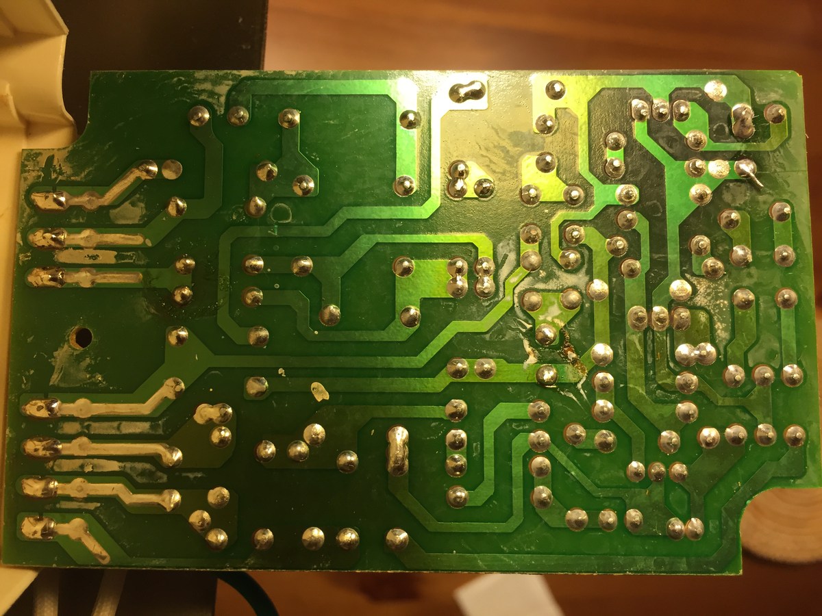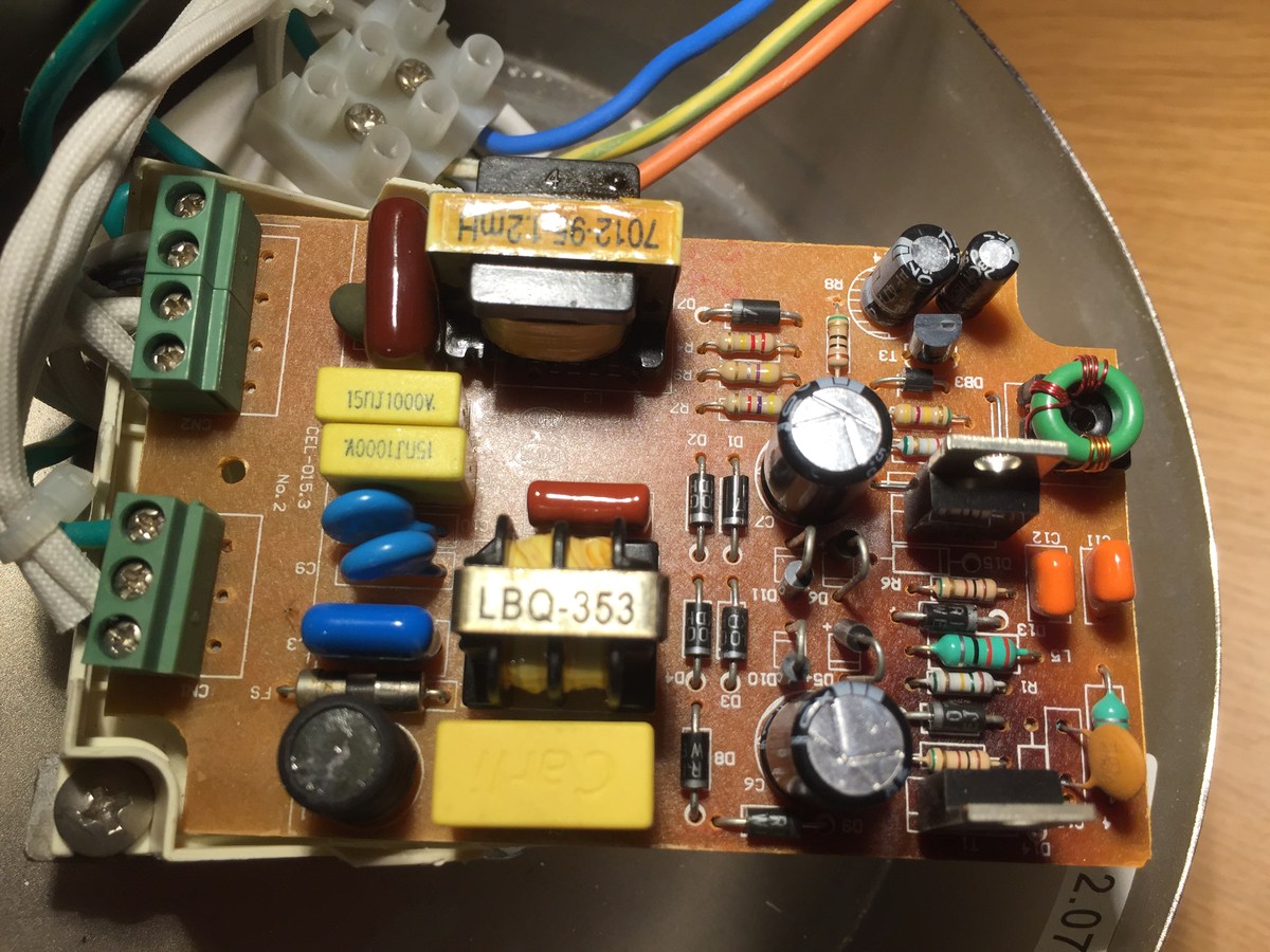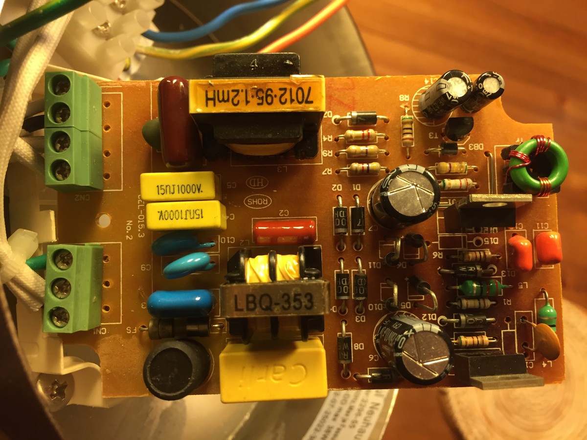 Ich glaube nicht, das der defekte Kondensator der Vorheizkondensator ist. Der ist viel zu weit weg vom Ausgang platziert. Der neben der braune Ausgangkondensator (am Ausgangsdrossel) könnte sein.