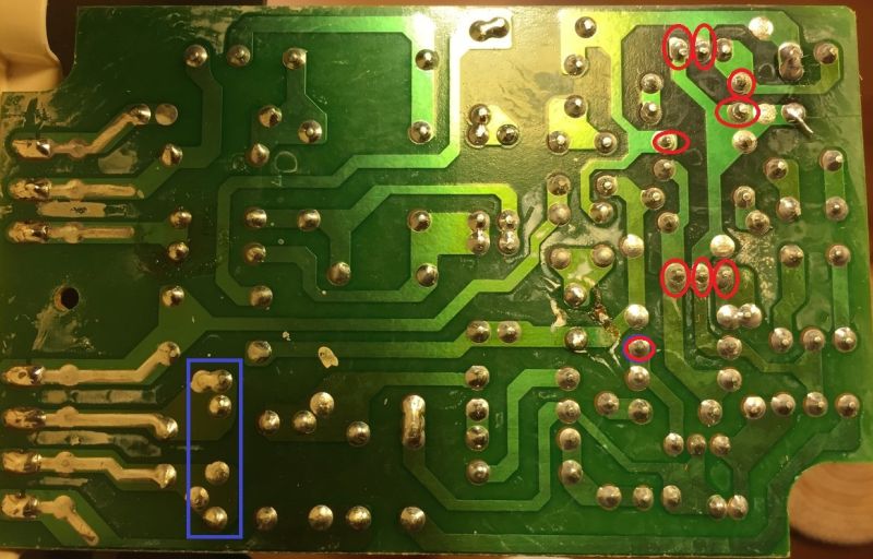 Im angehängten Bild habe ich mal mit rot alle zweifelhaften Lötstellen eingekreist, die ich gefunden habe und die du erstmal nachlöten solltest. Als verdächtiges Bauteil gilt immer der Kondensator, den ich mit blau eingezingelt habe. Ein Austausch desselben könnte helfen, wenn die Nachlöterei alleine nichts bringt.