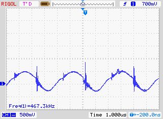 Achim S. schrieb: > Aber ein genaues Bild der Messung würde mich auch interessieren. Hallo Achim, vielen Dank für deine Antwort! Ich habe an X2 den Kolben angeschlossen und in Reihe dazu einen 100mOhm Widerstand (ja, ein Leistungswiderstand in Keramik, deine Bemerkung dazu ist sehr hilfreich, hätte ich selber drauf kommen müssen...) Ich habe über dem Widerstand mein Oszi angeschlossen (an eine Seite Oszi-Masse und an die Andere den Tastkopf). Die Oszi-Masse und die Masse der gemessenen Schaltung sind nicht verbunden (habe ich nachgemessen). Achim S. schrieb: > Ansonsten wäre noch denkbar, dass deine Spule bei 250kHz nicht mehr > perfekt funktioniert, sie ist nur bei 1kHz spezifiziert. Ihr > Eisenpulverkern könnte evtl. bei 250khz schon schlechter werden (je nach > Art des Eisenpulverkerns gibt es da ziemliche Unterschiede, wobei meiner > Erfahrung nach eher die Verluste zunehmen als dass die Induktivität > stark einbricht). Hast du einen Tipp, wo ich Spulen herbekomme die (bei ähnlicher Baugröße) besser geeignet sind? Nochmal zur Messung: Ich habe auch über dem Shunt R10 (http://www.distrelec.de/de/strommesswiderstaende-025-ohm-bourns-cra2512-fz-r025elf/) gemessen, das ist das andere Bild. Allerdings nicht nur über dem Shunt, sondern auch über ein Stück Leiterbahn. Daher denke ich das diese Messergebnisse nicht viel aussagen. Verwundern tun mich jedoch die negativen Spannungen und der verhältnismäßig große Spannungsfall, der jedoch durch schlechte Durchkontaktierung (keine Industrieplatine) erklärbar wäre.
