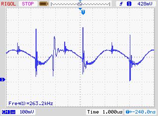 J. W. schrieb: > Ich habe an X2 den Kolben angeschlossen und in Reihe dazu einen 100mOhm > Widerstand So hatte ich es schon zuvor verstanden, aber: war der Kolben an X2-4 und der Shunt an X2-3 oder war es umgekehrt? Sieht dein Ergebnis gleich aus, wenn der Shunt an X2-4 hängt? J. W. schrieb: > Die Oszi-Masse und die Masse > der gemessenen Schaltung sind nicht verbunden (habe ich nachgemessen). Wenn du es per Multimeter nachgemessen hast, dann weißt du: es fließt kein Gleichstrom über die Masseverbindung. Aber ob bei 250kHz vielleicht ein Wechselstrom drüber fließt, weißt du nicht. J. W. schrieb: > ein Leistungswiderstand in Keramik "Leistungswiderstand in Keramik" kann viel bedeuten ;-) War es ungefähr so ein Teil, wie dein R10? (dann würde ich mir um die parasitären Größen nicht zu viel Gedanken machen). Oder war es eher was mit gewickeltem Draht? (Dann hätte ich deutlich mehr Bedenken). J. W. schrieb: > Hast du einen Tipp, wo ich Spulen herbekomme die (bei ähnlicher > Baugröße) besser geeignet sind? erst würde ich mal versuchen rauszufinden, ob es wirklich an der Spule liegt. Hast du irgendwo Zugriff auf ein halbwegs brauchbares LCR-Meter? Zur allergrößten Not kannst du die vorhandene Spule auch mal in Serie zu einem 150Ohm Widerstand schalten (Metallschicht), einen 239kHz-Sinus draufgeben und mit dem Oszi schauen, ob die Amplitude an Spule und Vorwiderstand ungefähr gleich groß ist. J. W. schrieb: > Nochmal zur Messung: > Ich habe auch über dem Shunt R10 > (http://www.distrelec.de/de/strommesswiderstaende-025-ohm-bourns-cra2512-fz-r025elf/) > gemessen, das ist das andere Bild. Welches "andere Bild"? Ich sehe nur die Messung an deinem externen Shunt (aaaFile8.bmp) Und bei folgender Aussage fände ich interessant, was genau damit gemeint ist, dass "es bei Tastverhältnissen <95% nicht funktioniert"? J. W. schrieb: > R10 ist Messshunt für eine Strommessung mit MAX4372, diese funktioniert > (vermutlich aufgrund des hohen Ripples) aber nur bei einem > Tastverhältnis >95%. Lothar M. schrieb: > Da müsste man mal wissen, welche Spule du da jetzt eingebaut hast... diese hier: J. W. schrieb: > http://www.reichelt.de/Funkentstoerdrosseln-Ringkern/TLC-5-0A-100-/3/index.html?ACTION=3&GROUPID=3182&ARTICLE=105606&OFFSET=500&
