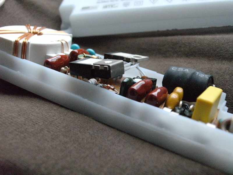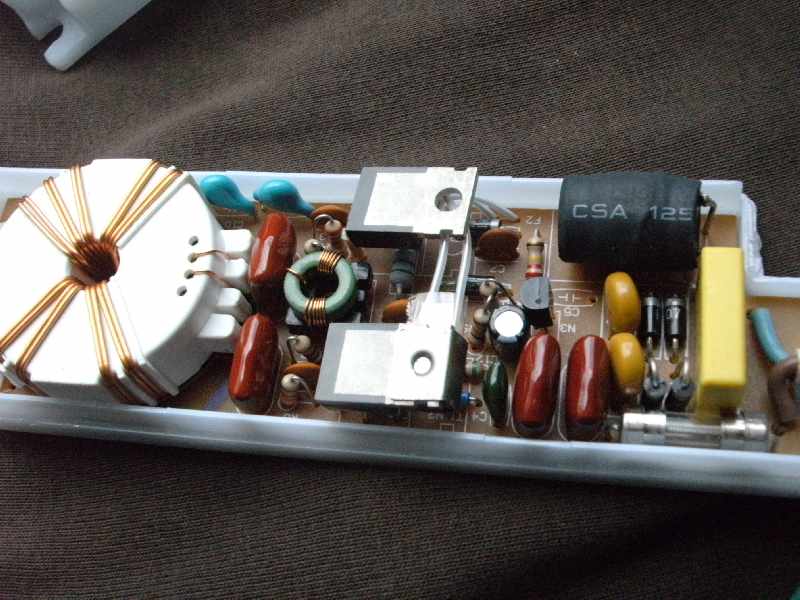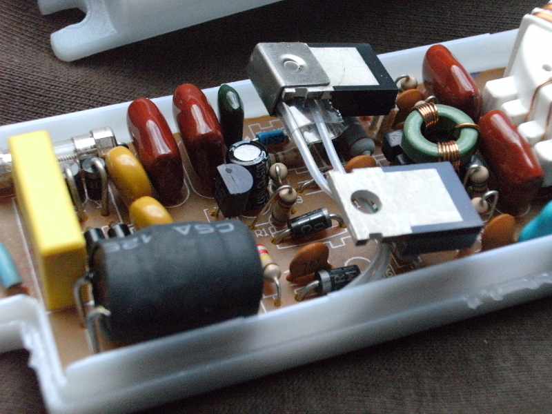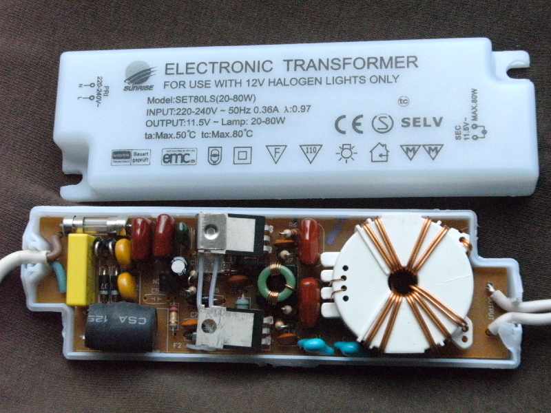 Hallo allerseits, mir kam so ein Schaltnetzteil in die Hände aus einer defekten Lampe, die vier Halogen-Birnchen zu 20 Watt hat. Den Blick in das Schaltnetzteil wollte ich euch nicht vorenthalten. Immerhin möchte das Teil bei seiner geringen Größe ohne jede Kühlung 80 Watt Ausgangsleistung haben. Wie das gemacht wird, sieht man auf den Fotos. Interessant die Klammer am TO220-Bauteil, das den Temperaturfühler fest hält. Wirklich eine Ausgeburt an Betriebssicherheit! Das Gerät ist sicher, denn es ist ja nichts weiter passiert, außer daß es defekt ist. Nun zu meinen Fragen: 1. Hat vielleicht jemand eine Schaltung zu einem ähnlichen Gerät? Ein IC ist anscheinenend nicht drinnen. 2. Ist das ein selbstschwingender Wandler? 3. Netztrennung ist notwendig aufgrund der blanken Kabel zu den Halogenbirnen. Ist die kleine Spule wirklich gut genug dafür? 4. eignet sich dazu ein Stepdown-Wandler oder verwendet man dafür eher einen Flyback-Wandler (Sperrwandler)? 5. Interessant ist noch die Mindestlast von 20 Watt. Was passiert, wenn alle Birnchen defekt oder abgezogen sind? 6. Warum steht nirgends "Made in China?" Immerhin kein SMD und alles "echte" Bauteile, die jede Einfach-Fabrik verarbeiten kann. 7. Wie kann Zweckentfremdung zum Betrieb einer Modellbahn ausgeschlossen werden? Schon mal danke fürs Lesen und Beantworten. mit freundlichem Gruß