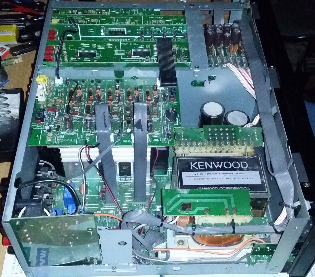 Hallo, ich habe hier einen Kenwood KRV-999D AV-Receiver, der beim Einschalten meistens entweder keinen Ton von sich gibt oder es fliegen einem die Ohren weg. Da mir langsam die Ersatzohren ausgehen, würde ich die Symptome gerne zur Diskussion stellen. :) Ich habe unten ein Video angehängt, das veranschaulichen soll, wie das Gerät in kaltem Zustand reagiert. Der Erststart zeigt starke Verzerrgeräusche (kommen im Video aus Sicherheitsgründen von angeschlossenen In-Ohr Kopfhörern), die langsam abklingen. Die zwei weiteren Startvorgänge haben keine Verzerrungen mehr und in der Regel geht das Gerät dann wieder bis zum Abschalten. Lautstärke ist auf 0. Die Symptome sind fließend mit der Zeit (vielleicht über 3-4 Jahre) stärker geworden. Mittlerweile startet das Gerät fast immer auf diese Art oder der Überlastschutz greift beim umlegen des Relais (secondary power) und schaltet das Gerät komplett ab. Dann muss man mehrere Startvorgänge machen. Irgendwann pendelt sich das scheinbar ein (maxmimal 3 bis 4 mal) und das Gerät funktioniert bis zum Ausschalten einwandfrei. Als würde das Gerät eine Betriebstemperatur oder eine Kondensatorladung nicht aufbauen können. Meist verhindert der Überlastschutz eine längere "Aufladezeit". Auffällig ist der länger drehende Lüfter, der schon vor dem Relais verdächtig hoch dreht. Dieser bewegt sich im Idealfall nur kurz. Im Video dreht er deutlich länger, im Überlastfall dreht er wohl permanent bis zur Abschaltung. Ich bin mir nicht sicher, ob das zusammenhängt. Selbst wenn das Gerät funktioniert, laufen die B-Speaker nicht im Stereomodus. Es kommt (hinten) nur lauteres Rauschen, das nicht auf Lautstärkeänderungen reagiert. Die Endstufe (für die hinteren Boxen), die in diesem Fall scheinbar nicht "gezündet" wird, dürfte aber in Ordnung sein, da sie im Surround-Modus funktioniert. Könnte ein isoliertes/unabhängiges Problem sein. Ich will es nur nicht unerwähnt lassen. Manchmal kann man anstatt des undefinierten, übersteuerten Rauschen ein starkes Brummen (Masse?) und die Steuersignale der Lautstärke hören (wenn man denn daran herumdreht). Ich habe bereits einiges nachgelötet (Flachbandkabel, Gleichrichter und die dicken Kondensatoren, die AVRs und sämtliche TO220 Transistoren). Das Gerät wurde mehrfach komplett zerlegt und sämtliche Stecker nachgesteckt. Und jetzt weiß ich erst mal nicht weiter... Habt ihr vielleicht Ideen oder Vermutungen, woran das liegen könnte? Schaltplan verfügbar: http://elektrotanya.com/kenwood_kr-v999d_kr-1090vr.pdf/download.html Video: https://dl.dropboxusercontent.com/s/dxpeuuzfmow4bcr/Kenwood.KRV999D-PowerOn-distort.mp4 (MP4, h264, AAC, 1:30min, 6MB) Lothar K. schrieb: > Schlecht starten??? > Zieht das Lautsprecher-Relais erst nach langer Wartezeit oder mehreren > Einschaltversuchen an? Dann hast du vermutlich DC-Offset an den > Ausgängen. > Auch eine Folge von ausgetrockneten oder gar ausgelaufenen Elkos. Dann > aber in der Endstufe . . . > Ein häufiger Fehler bei Geräten aus den 90er Jahren. Das (secondary power) Relais zieht eigentlich immer recht schnell an. Die Lautsprecherrelais an den Ausgängen ziehen auch sofort nach dem secondary power Relais an. Edit: Wobei ich bei den Lautsprecherrelais nicht ganz sicher bin. Manchmal kommt ja auch kein Ton. Und ob das Klopfen auf den Deckel wirklich manchmal geholfen hat, da bin ich mir nicht sicher...