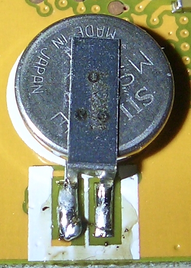 Was ist das - eine Batterie oder ein Supercap oder was ganz anderes? Die gemessene Spannung beträgt (nur noch) etwa 0,58V. Wenn ich das Teil für 20s kurzschließe, dann bricht die Spannung stark ein und erholt sich anschließend wieder auf den ursprünglichen Wert. Der Durchmesser beträgt 6,8mm, die Dicke 1,6mm. Zum Größenvergleich habe ich ein Bild der Platine mitangehängt. Das dunkle Teil rechts oben ist zum Beispiel ein SD-Karten-Halter.