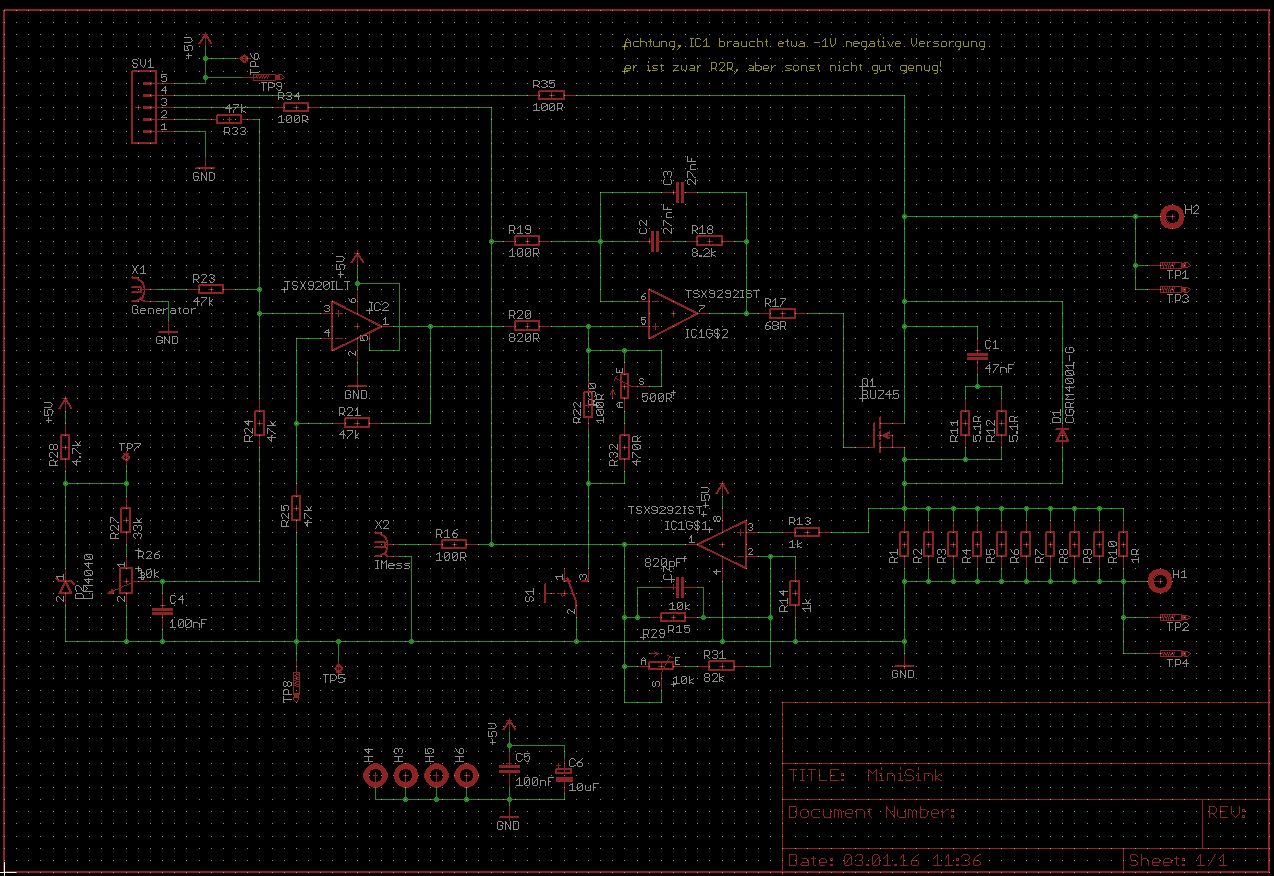 > Die Schaltung wurde schon realisiert & läuft. Erzaehl mal wie du das getestet hast. Oder besser zeig mal ein paar Oszibildchen wie die Schaltung mit Lastwechseln klar kommt. :-) Ich habe vor einiger Zeit aehnliches gemacht. Diskussion dazu in d.s.e. Zusaetzlich zu deiner Schaltung habe ich aber noch einen Modulationseingang wo ich meinen Funktionsgenerator anschliessen kann und einen Ausgang wo man auf dem Oszi den aktuellen Stromverlauf sehen kann. Beides erscheint mir sehr sinnvoll wenn man mit seiner Last mehr machen will als nur eine Batterie zu entladen. Der Grund warum ich Frage: Es kostet einigen Aufwand so eine Schaltung bei ueblichen aber nicht beliebigen Lasten hinreichend stabil zu bekommen. Und das gilt ganz besonders dann wenn man den Mosfet nicht festlegt. Ich verwende im uebrigen einen BUZ45. Ich haenge mal meine Schaltung zum Vergleich an. Ich garantiere aber schwingfaehigkeit wenn man nicht zu 100% identische Bauteile verwendet. Allerdings laesst sich das durch rumspielen mit R17, C2, R18, C3 und C7 hin bekommen. Ich selbst bin im uebrigen mit 1A Strom zufrieden. Von daher erstaunt es mich sehr das deine Schaltung stabil ist weil deine dicken Mosfet ja noch eine groessere Gatekapazitaet haben duerften. > Parameter sollten/werden mittels µC abgefragt (AtMega48/Bascom) & gg. > veränderbar sein. Bei mir wird das ein SH2 von Renesas. :-) Bin ich aber noch nicht zu gekommen. Olaf