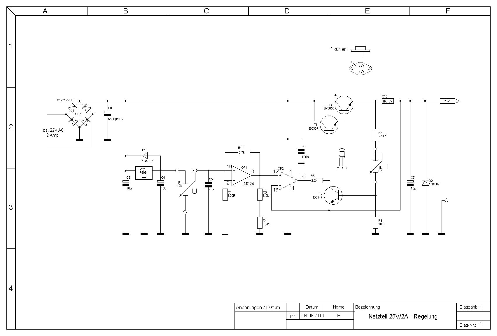 Moin das ist aus heutiger Sicht kein Labornetzteil. Wenn Du das so einfach bauen möchtes, nimm einen LM200. Der ist alle mal besser als Deine Schaltung. Bis 35 Volt und 1.5 A. Oder Boosten und gut ist. Holger